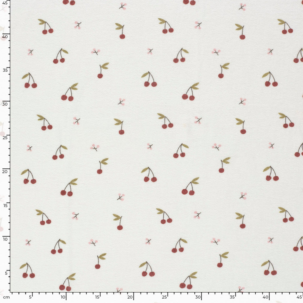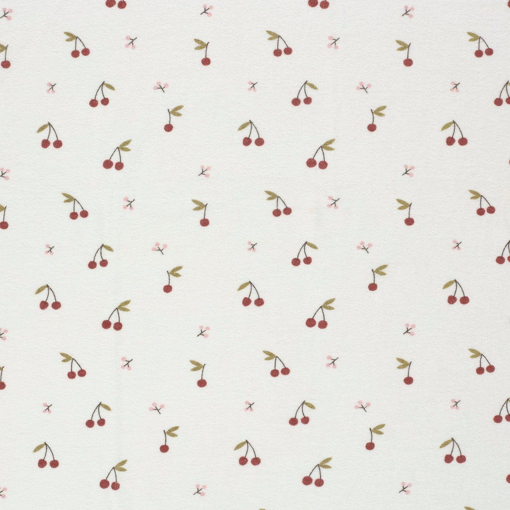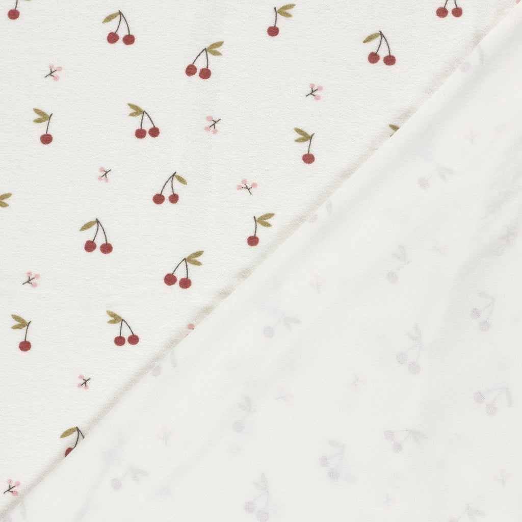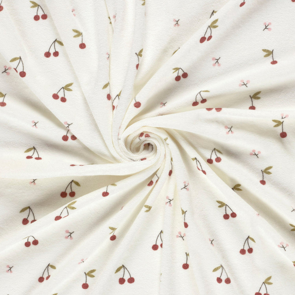 Unser Frottee-Stretch Stoff mit fröhlichen Kirschen auf wollweißem Hintergrund bringt Spaß und Komfort in jede Baby-Kollektion. Der weiche, elastische Stoff passt sich spielerisch jeder Bewegung an und sorgt für kuschelige Stunden voller Freude. Ideal für niedliche Kinderkleidung, die nicht nur bezaubert, sondern auch bequem sitzt.