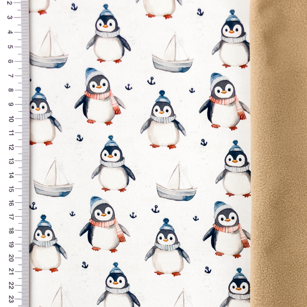 Dieses weiche Softshell-Material begeistert mit niedlichen Pinguinen und Booten auf weißem Hintergrund – perfekt für Kinderkleidung und Accessoires. Der Stoff schützt zuverlässig vor Wind und Wetter, während das verspielte Design kleine Entdecker zum Strahlen bringt. Ideal, um coole und bequeme Outfits für aktive Kinder zu zaubern.