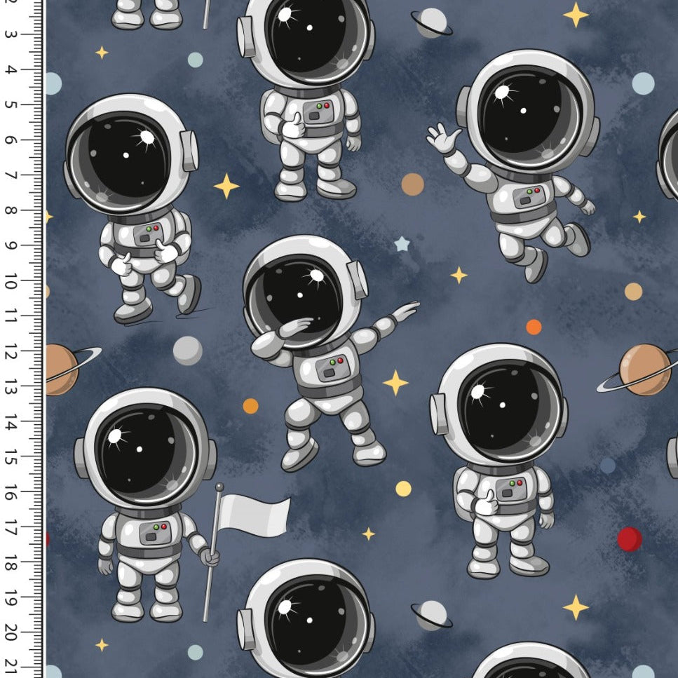 Dieser weiche Sweat-Joggingstoff mit Astronauten-Motiv bringt galaktischen Spaß in deine Nähprojekte. Perfekt für gemütliche Hoodies oder lässige Jogginghosen – er sorgt für Komfort und stylische Outfits, die zum Abheben einladen. Ideal für kleine Raumfahrer und große Weltraumfans!