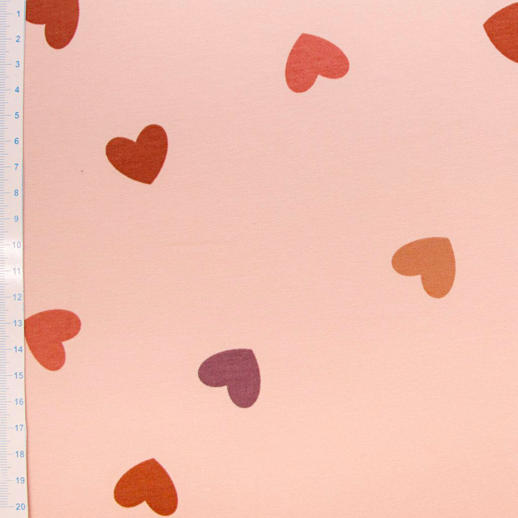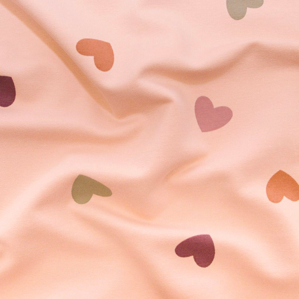Dieser fröhliche French Terry Sweatstoff in hellem Pink mit bunten Herzen ist perfekt für deine kreativen Nähideen. Ideal für Hosen, Sweatshirts und mehr – er sorgt für bequemen Tragekomfort und einen spielerischen Look, der gute Laune verbreitet!