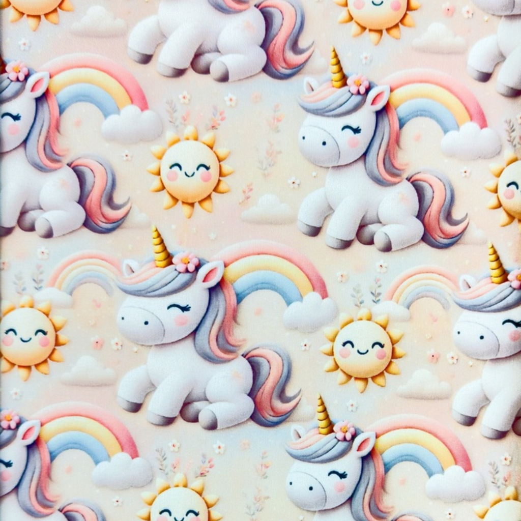 Tauche ein in die bunte Welt der Einhörner mit unserem weichen Softshell-Stoff! Mit fröhlichen Regenbogenfarben und süßen Sonnenmotiven bringt dieses Material Spaß und Magie in jedes Nähprojekt. Perfekt für kuschelige Jacken, Mützen oder Accessoires, die Kinderherzen höher schlagen lassen. Strapazierfähig und angenehm zu tragen – ein echter Hingucker voller Zauber!