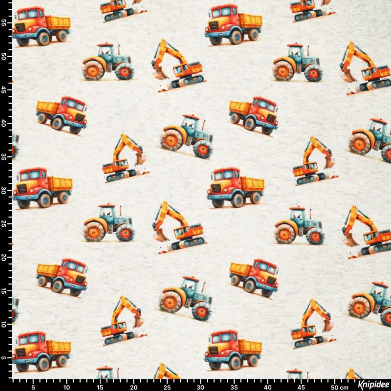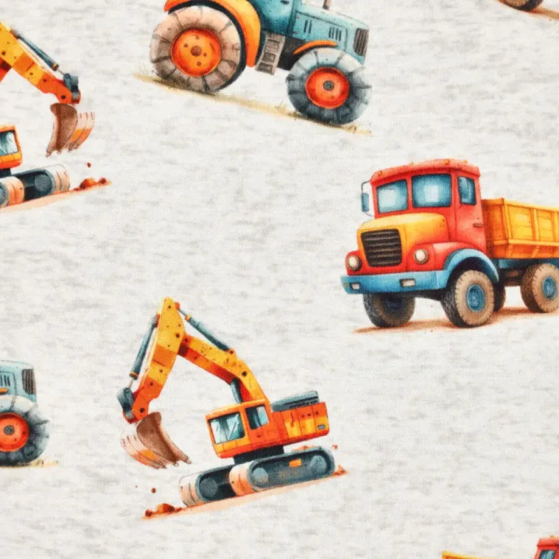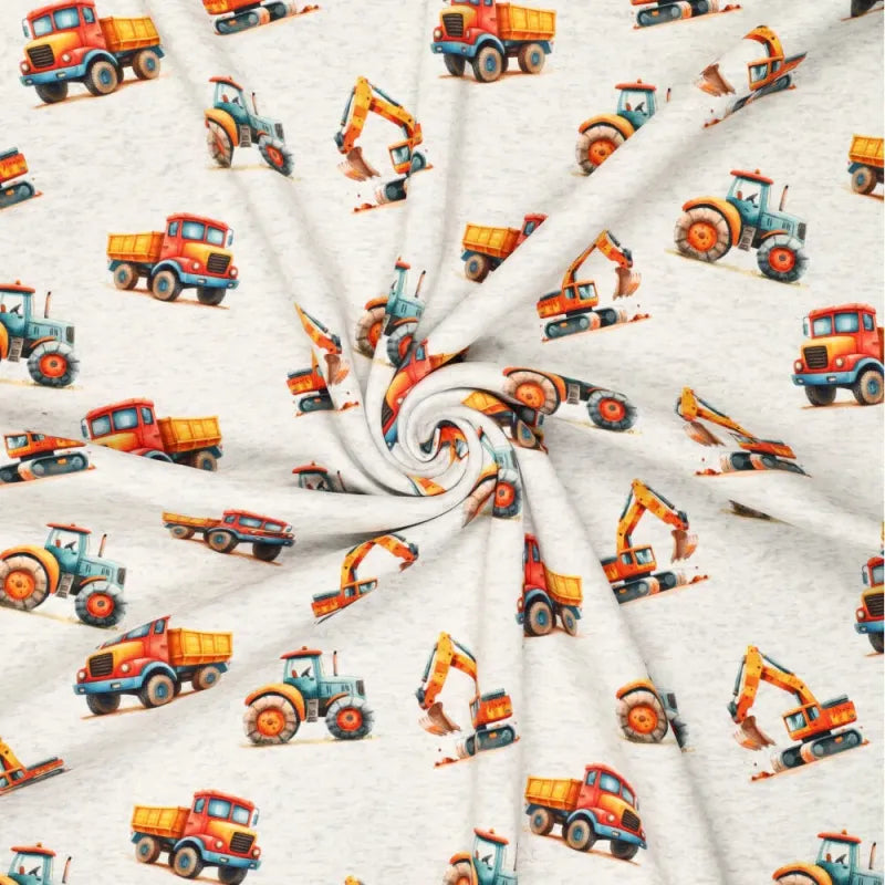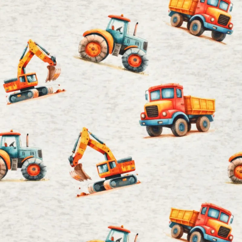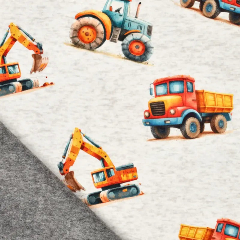 Der angeraute Alpenfleece Jogging Stoff „Trucky“ in wollweiß meliert begeistert kleine Entdecker mit coolen Bagger-, Traktor- und LKW-Motiven mit Anhänger. Superweich und warm ist er ideal für gemütliche Jogginghosen, Pullover oder Spielkleidung, die Kinder lieben. Perfekt, um Abenteuer und Komfort in einem kuscheligen Stoff zu vereinen!