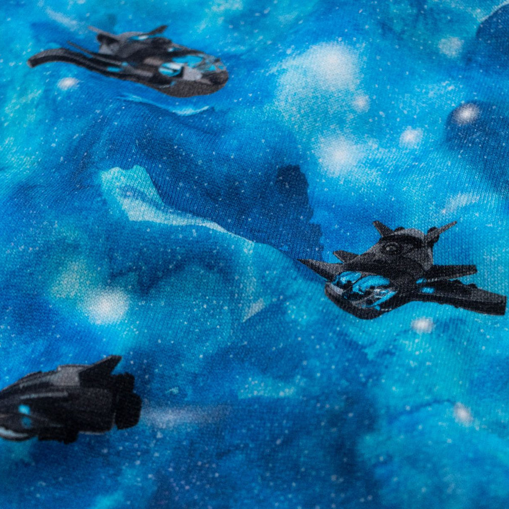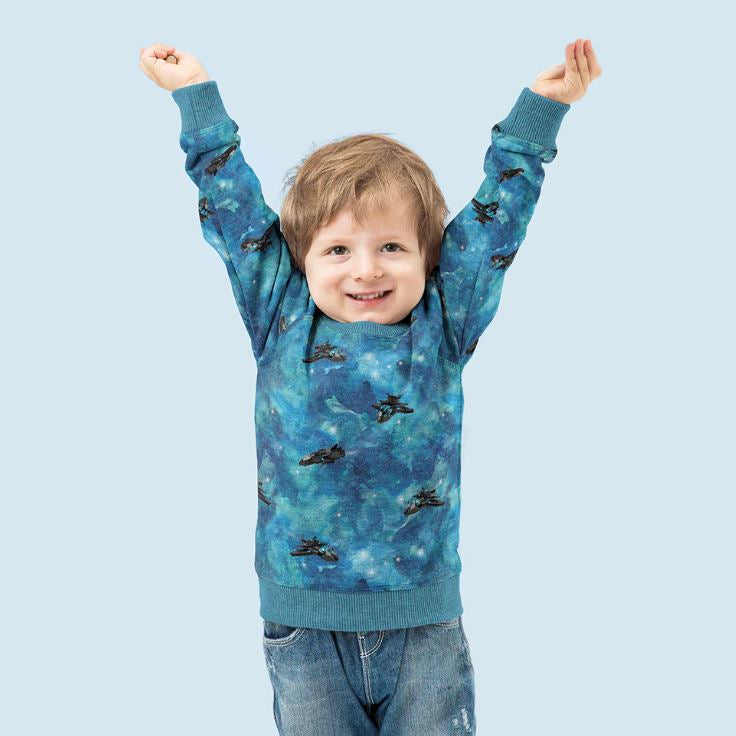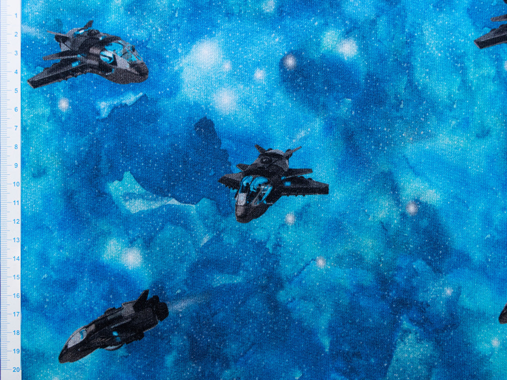 Angerauter Sweatstoff mit charmanten Raumschiff-Motiven vor kosmischem Hintergrund. Das weiche, aufgeraute Material bietet optimalen Tragekomfort und Wärmeisolation für Kinderbekleidung. Die hochwertige Verarbeitung garantiert Langlebigkeit auch bei häufigem Waschen. Ideal für Pullover, Hoodies und Jogginghosen – perfekt für kleine Weltraum-Enthusiasten.