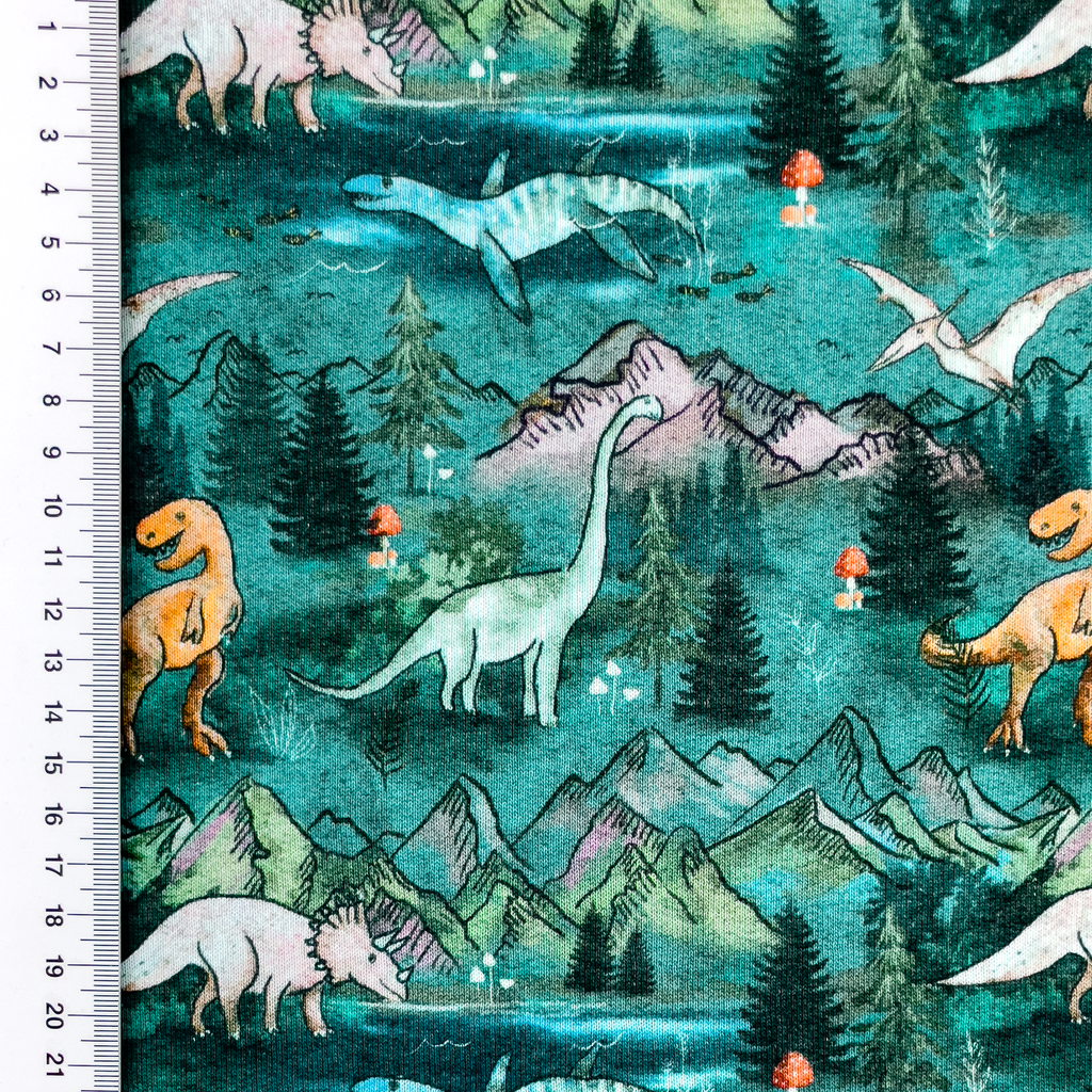 Hochwertiger angerauter Sweatstoff mit verspieltem Dinosaurier-Muster in leuchtendem Türkis. Die aufgeraute Oberfläche sorgt für wunderbare Wärmespeicherung und angenehme Griffigkeit – ideal für kuschelige Kinderkleidung, Hoodies oder Loungewear. Das robuste Material behält seine Form und Farbe auch nach mehrfachem Waschen. Perfekt für Näherinnen und Näher, die hochwertige Stoffe mit Charakter suchen.