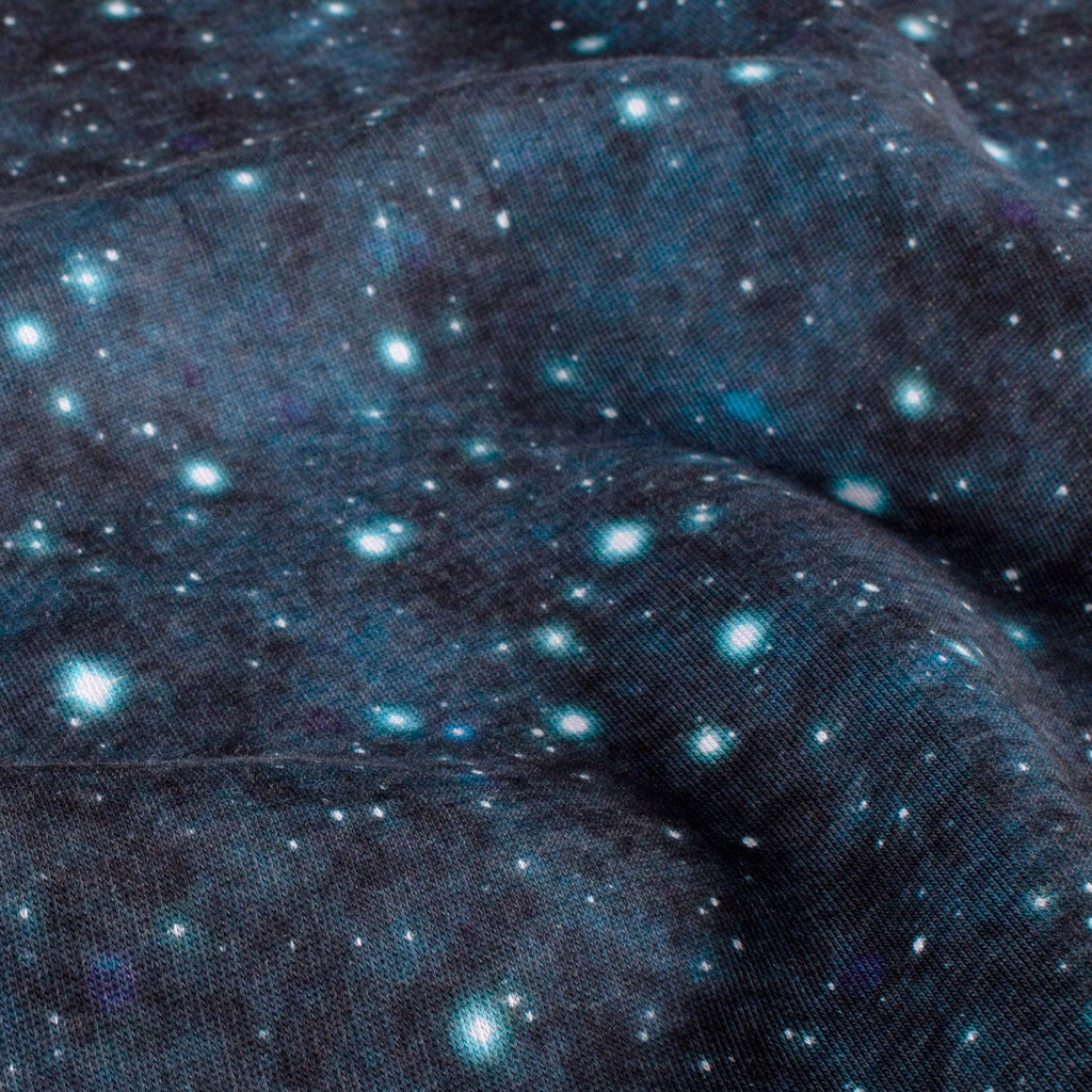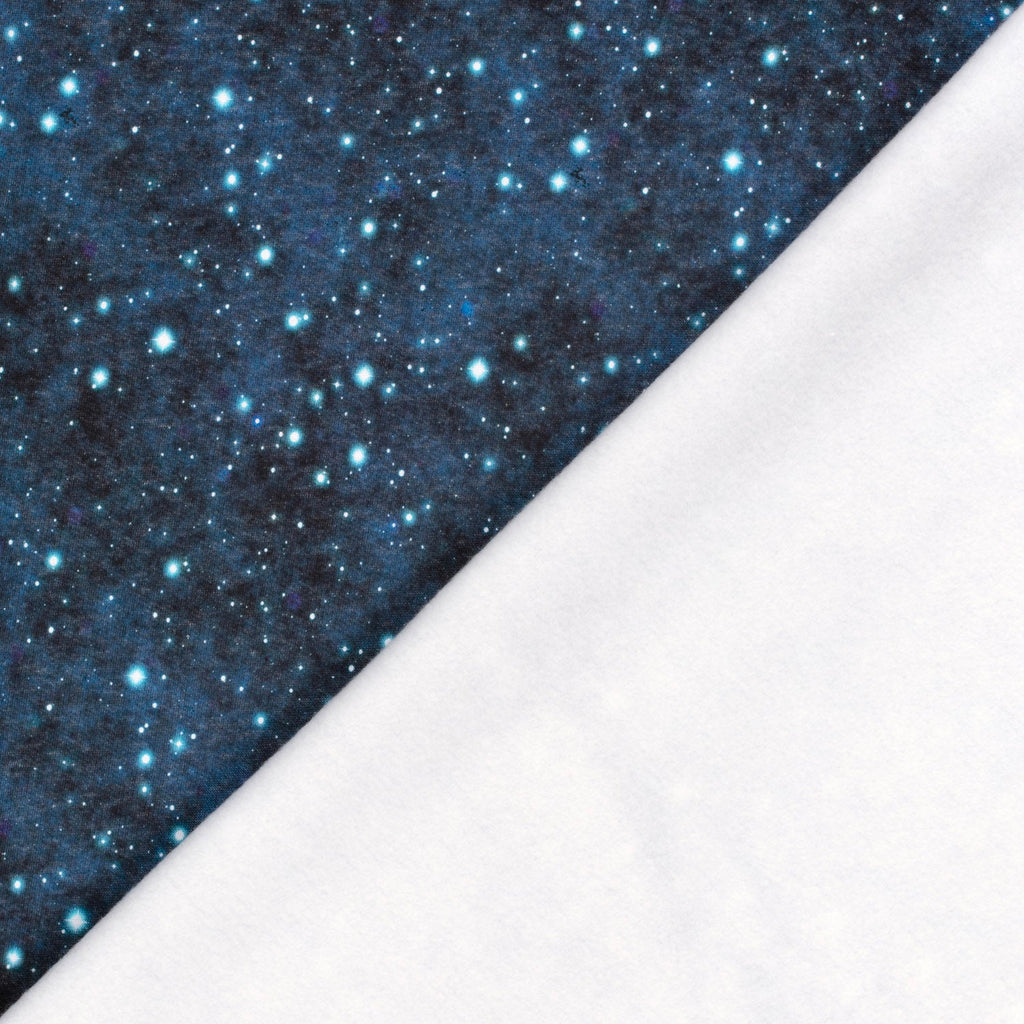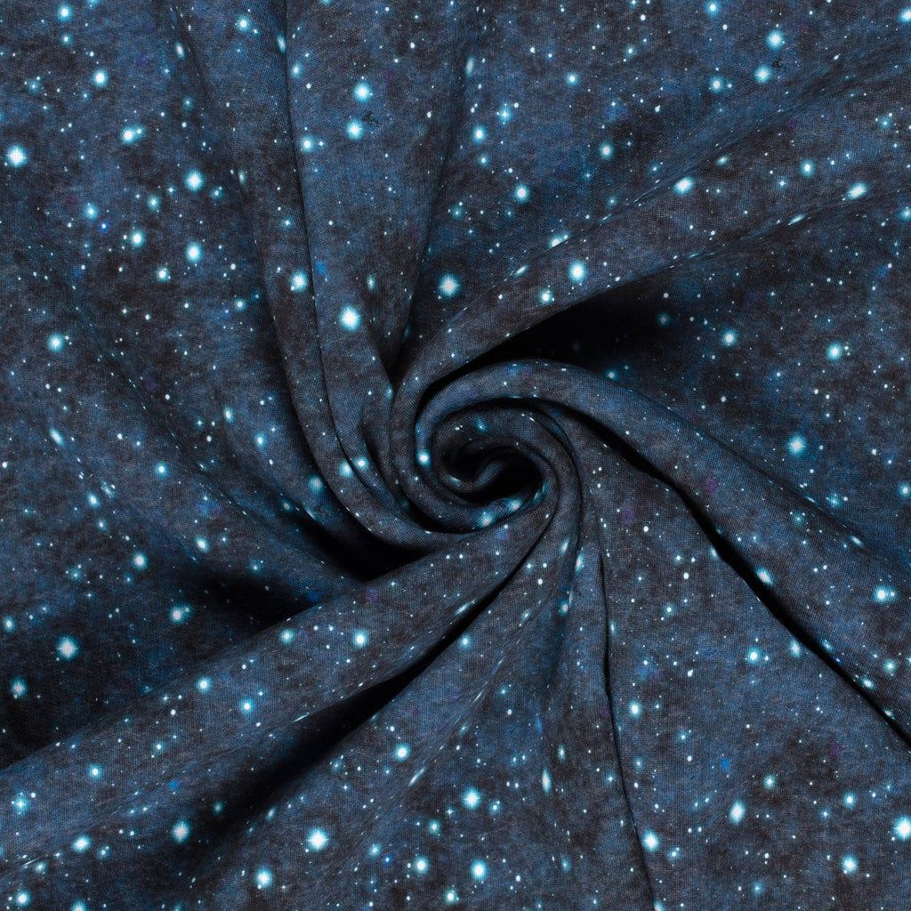 Dieser angeraute Sweat Stoff in Schwarz und Dunkelblau überzeugt durch seine weiche, aufgeraute Oberfläche, die besonders angenehm auf der Haut liegt. Das designorientierte Muster mit Sternen und Weltraum-Motiven verleiht jedem Nähprojekt eine moderne und dennoch zeitlose Note. Ideal für funktionale und komfortable Kleidungsstücke wie Sweatshirts, Hoodies oder gemütliche Jogginghosen. Die strapazierfähige Qualität sorgt für dauerhafte Formstabilität und hohen Tragekomfort auch bei häufigem Gebrauch.