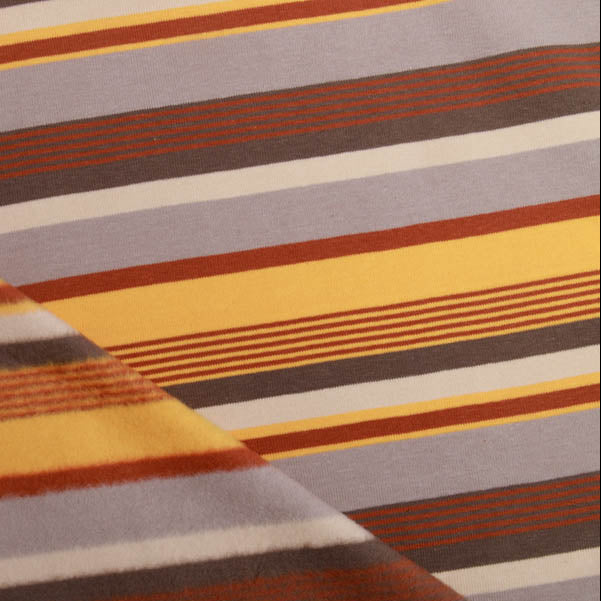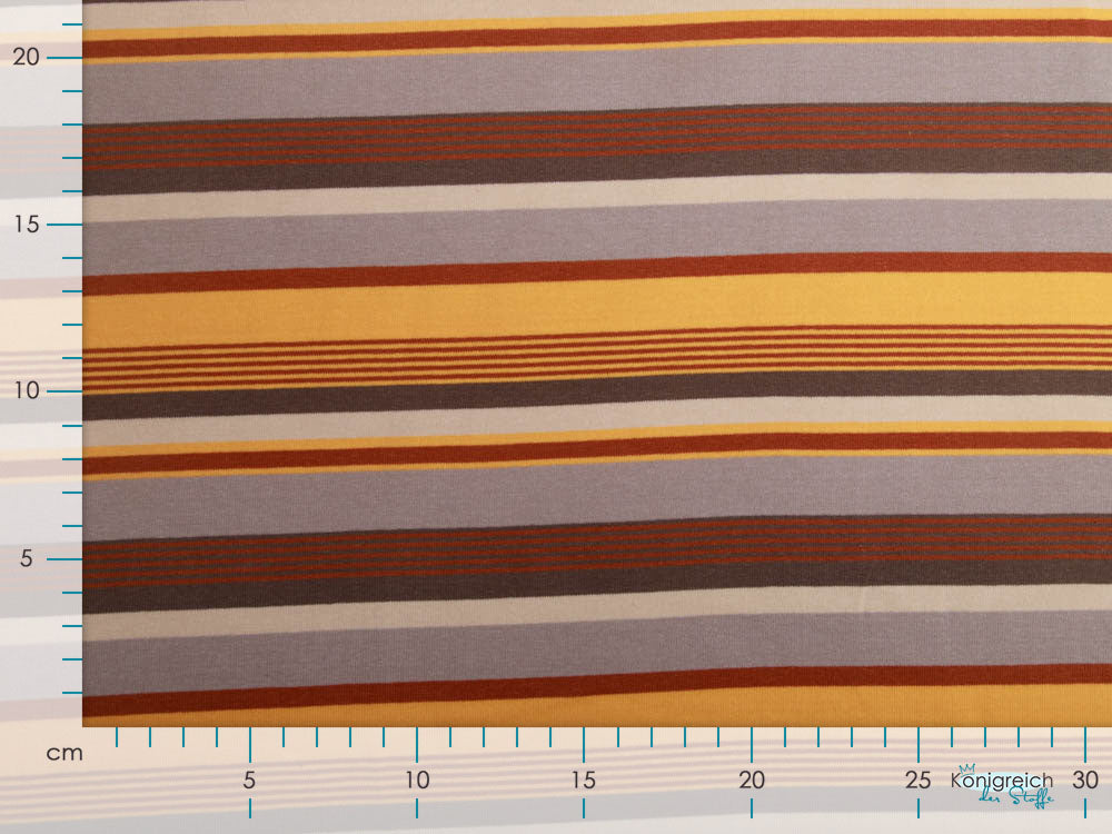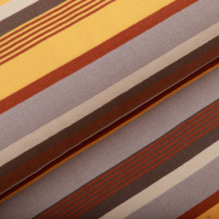 Hochwertiger Sweatstoff mit angerauter Oberfläche und klassischem Streifenmuster in Grau und Ocker. Das Material besticht durch seine weiche, griffige Haptik und bietet optimale Wärmeisolation für Herbst- und Winterkollektionen. Die Farbkombination verbindet zeitlose Eleganz mit modernem Design und eignet sich hervorragend für Pullover, Cardigans und Freizeitbekleidung. Die angeraute Verarbeitung verleiht dem Stoff zusätzliche Struktur und Langlebigkeit. Ideal für Näherinnen und Designer, die qualitativ hochwertige Materialien mit charaktervollem Muster suchen.