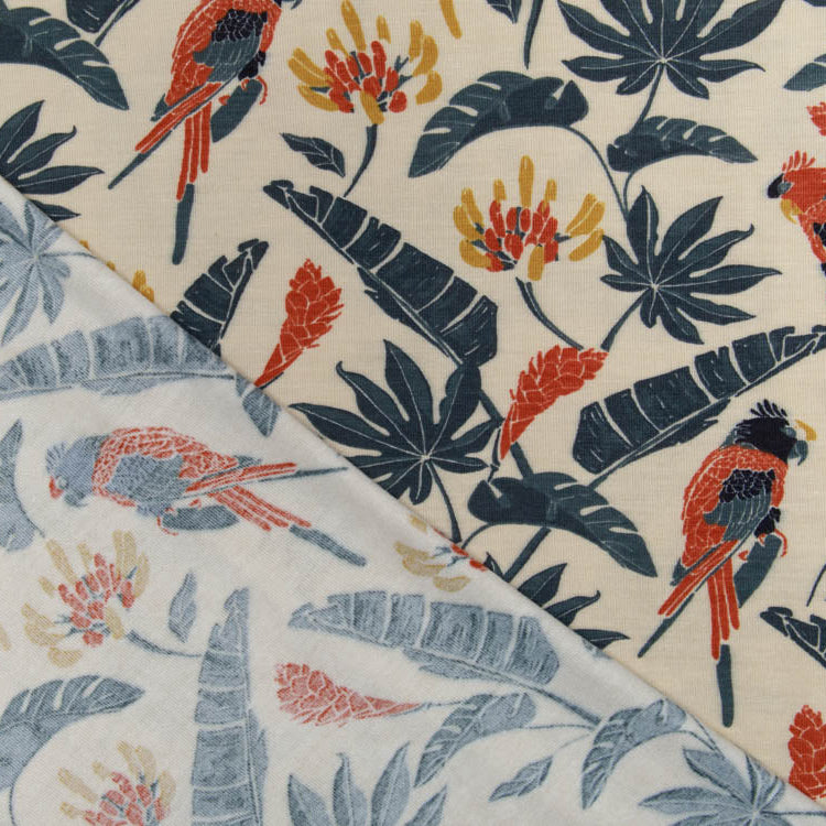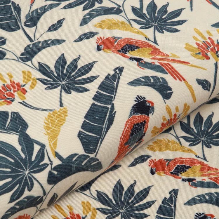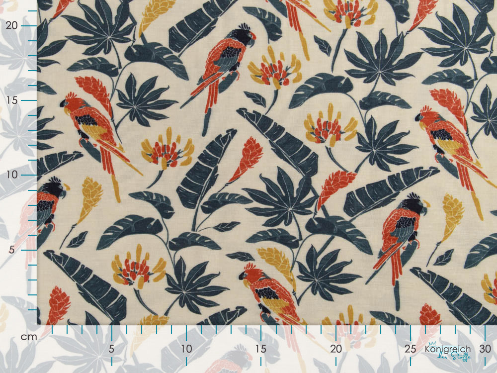 Tropische Vibes treffen auf Komfort! Dieser wunderbar weiche Bambus Jersey besticht mit einem verspielten Papageien- und Blättermuster in warmem Beige. Das natürliche Material ist hautfreundlich, atmungsaktiv und perfekt für Kleidungsstücke, die den ganzen Tag über angenehm sitzen. Ob Shirt, Kleid oder Pyjama – SARAH bringt Urlaubsfeeling in deinen Nähkorb und lässt dich mit jedem Projekt ein Lächeln aufsetzen.