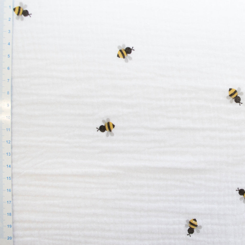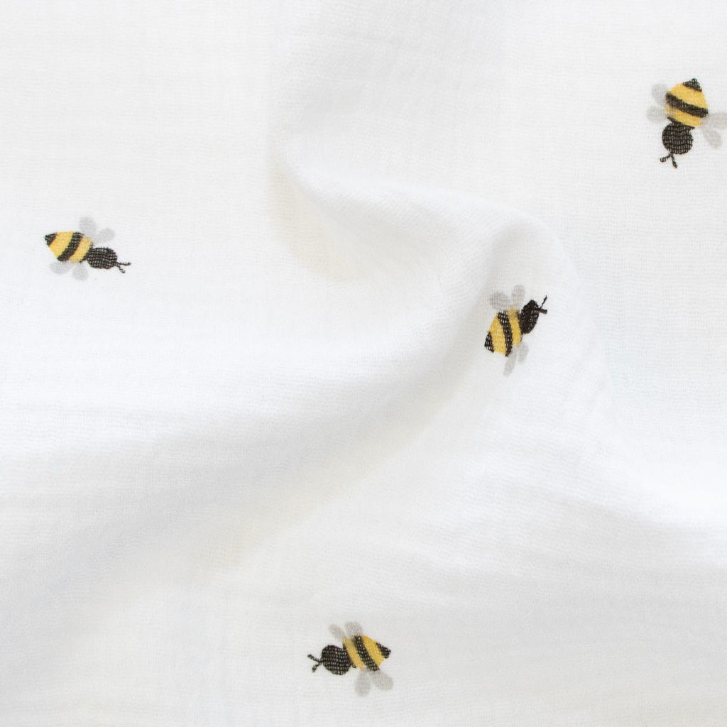 Zartes Baumwoll-Musselin in Double-Gauze-Qualität mit niedlichem Bienchen-Motiv auf wollweißem Grund. Der luftige Stoff besticht durch seine natürliche Weichheit und Atmungsaktivität – ideal für Kinderbekleidung, Windeln oder Accessoires. Die doppellagige Gaze-Struktur bietet optimale Feuchtigkeitsaufnahme und angenehmen Tragekomfort. Perfekt für kleine Entdecker, die sanfte Materialien verdienen.