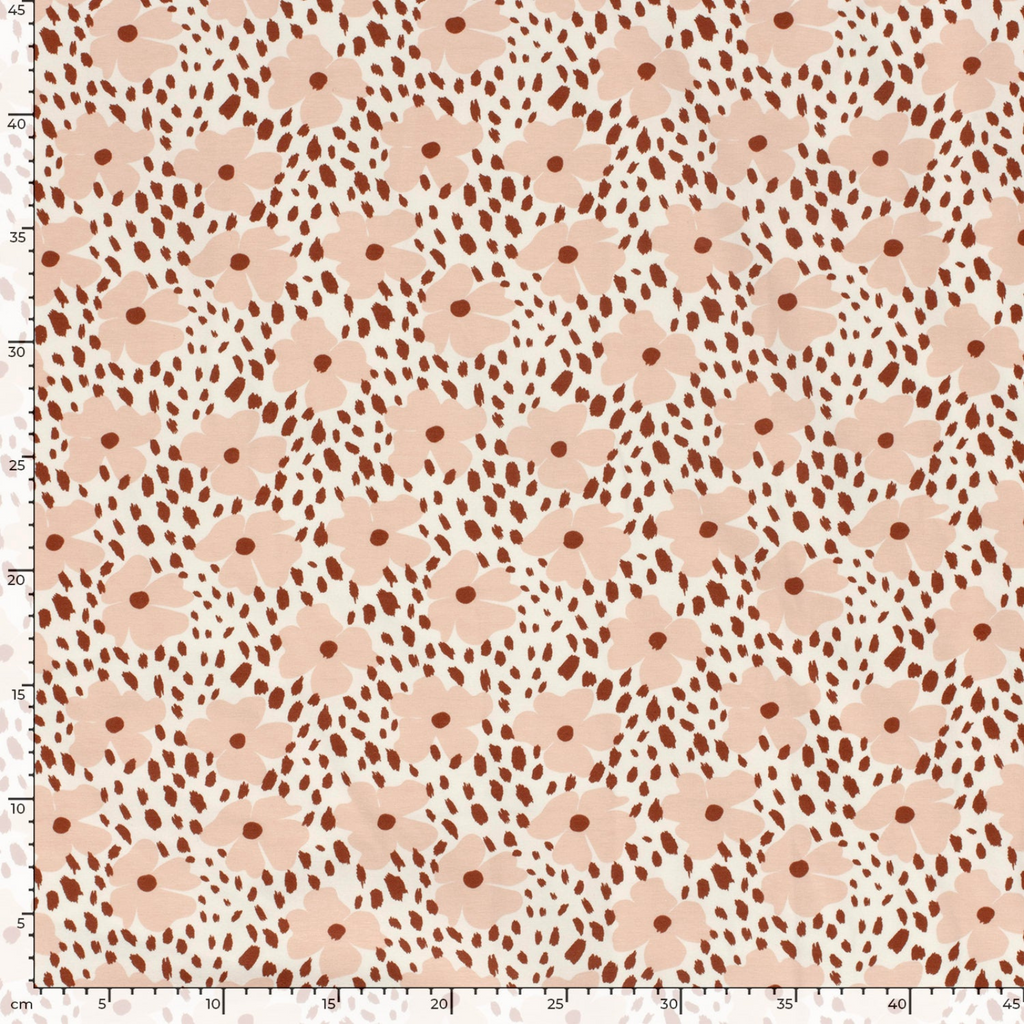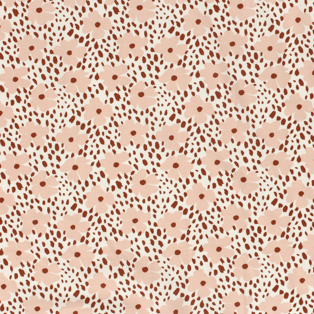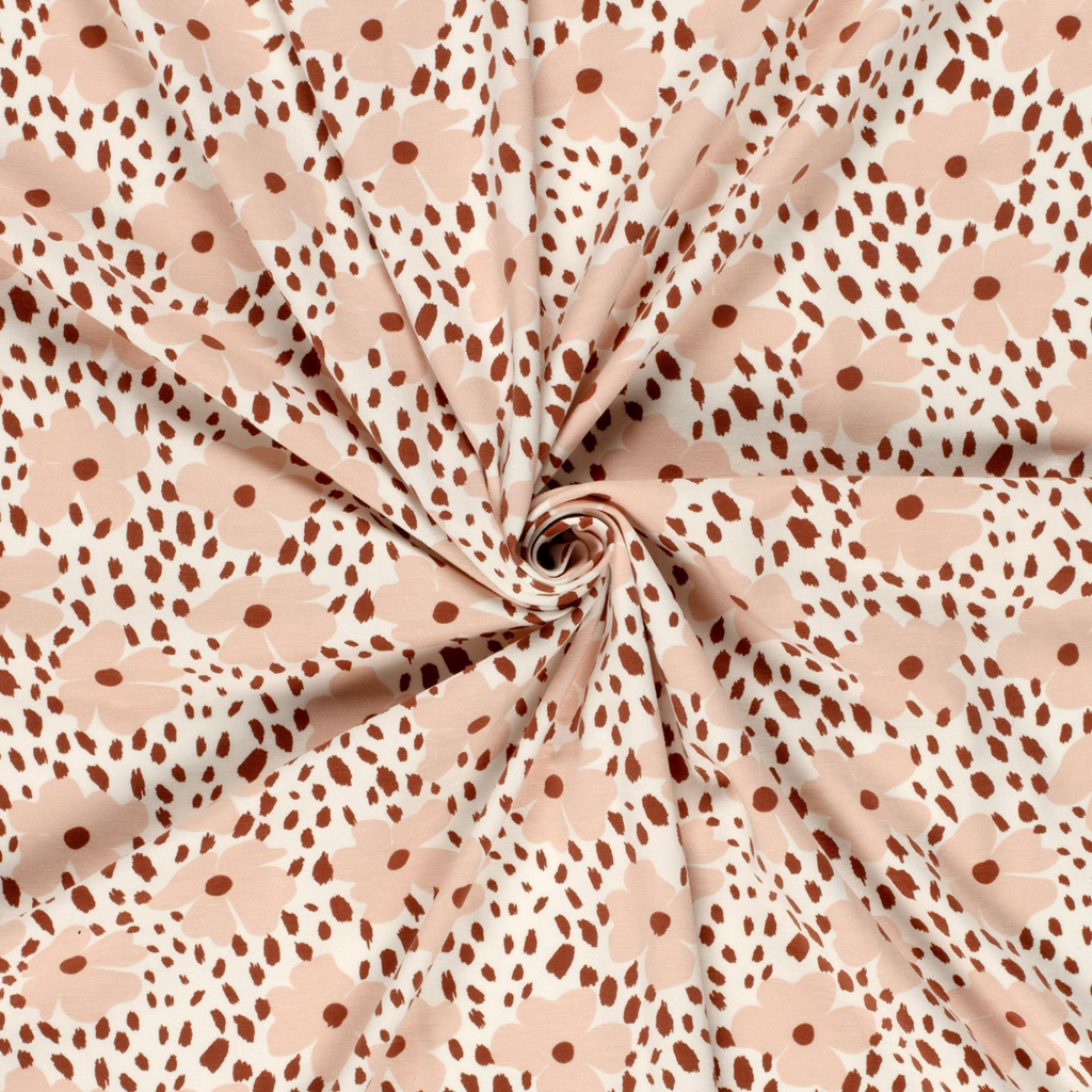 Dieser weiche Baumwoll-Jersey mit digital bedrucktem Blümchen- und Punktemuster in zartem Rosaton bringt verspielte Frische in jedes Nähprojekt. Die wollweiße Basis sorgt für einen sanften Look, während die farbenfrohen Details lebendige Akzente setzen. Perfekt für bequeme, fröhliche Kleidung oder kreative Accessoires, die Spaß machen und dabei angenehm zu tragen sind.