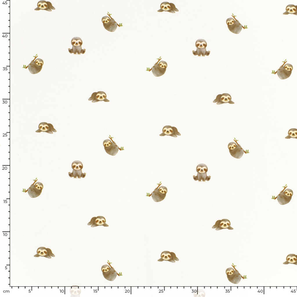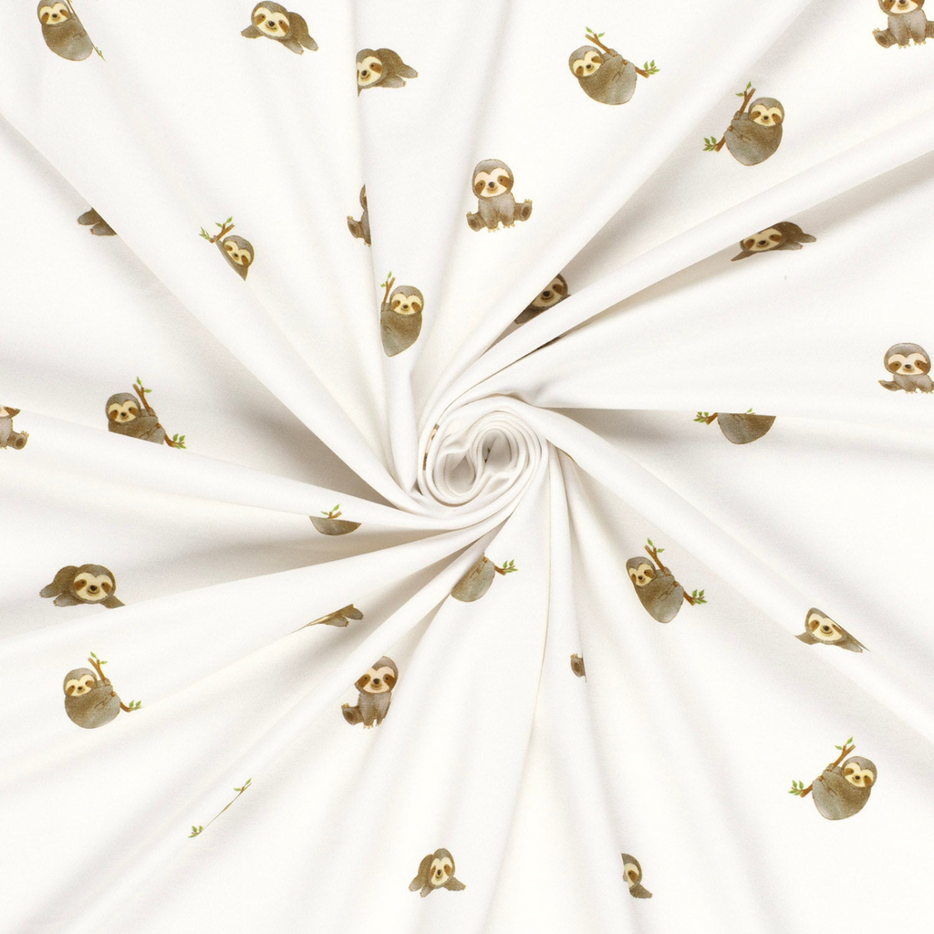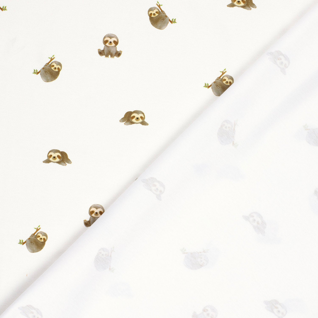 Entdecke unseren Baumwolle Jersey mit digital bedruckten, süßen Faultieren auf wollweißem Hintergrund. Dieses weiche und atmungsaktive Stoffmaterial bringt Spaß und Gemütlichkeit in deine Nähprojekte – perfekt für verspielte Kindermode oder gemütliche Freizeitkleidung. Der niedliche Faultier-Print sorgt garantiert für gute Laune!