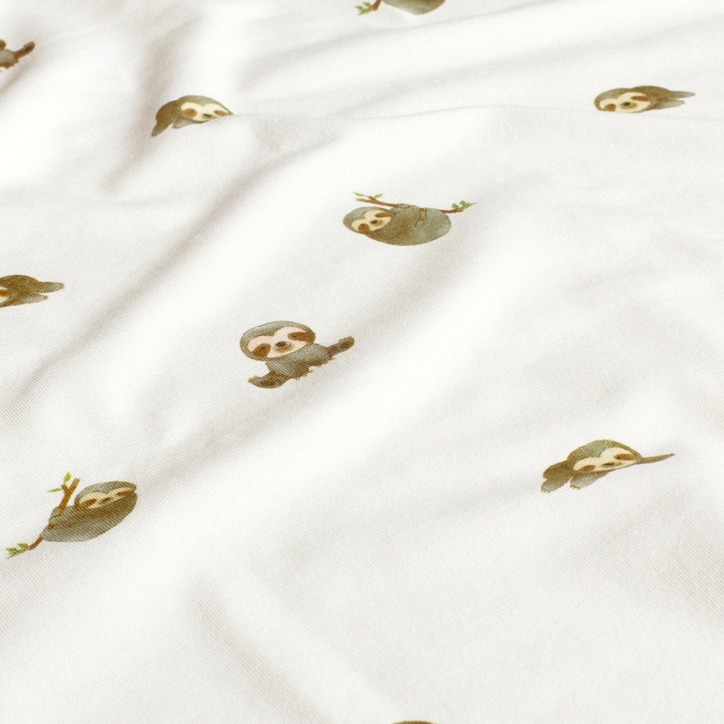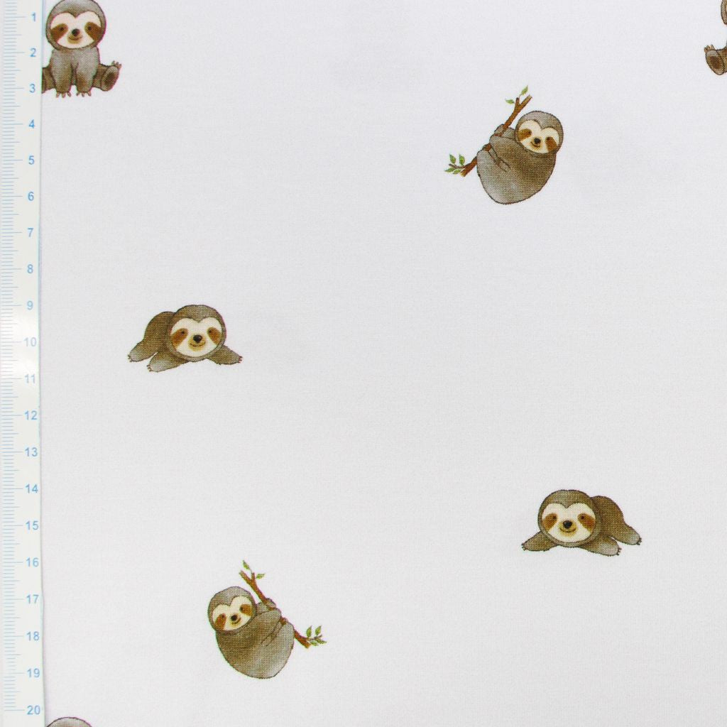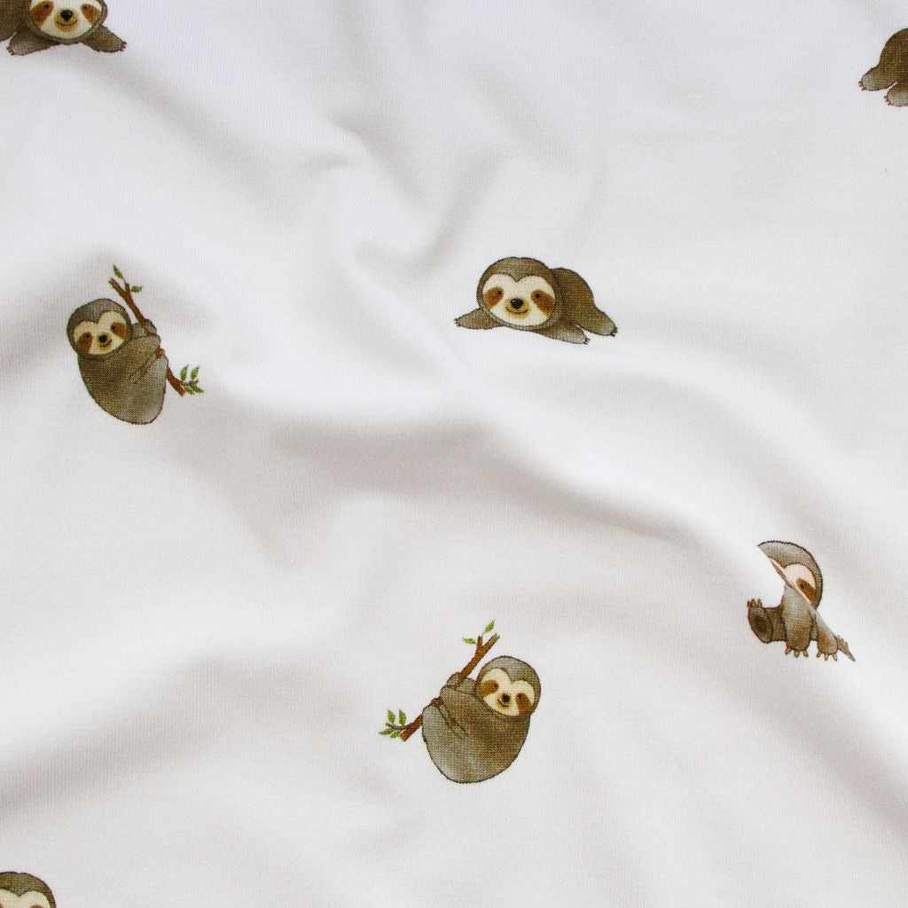 Entdecke unseren Baumwolle Jersey mit digital bedruckten, süßen Faultieren auf wollweißem Hintergrund. Dieses weiche und atmungsaktive Stoffmaterial bringt Spaß und Gemütlichkeit in deine Nähprojekte – perfekt für verspielte Kindermode oder gemütliche Freizeitkleidung. Der niedliche Faultier-Print sorgt garantiert für gute Laune!