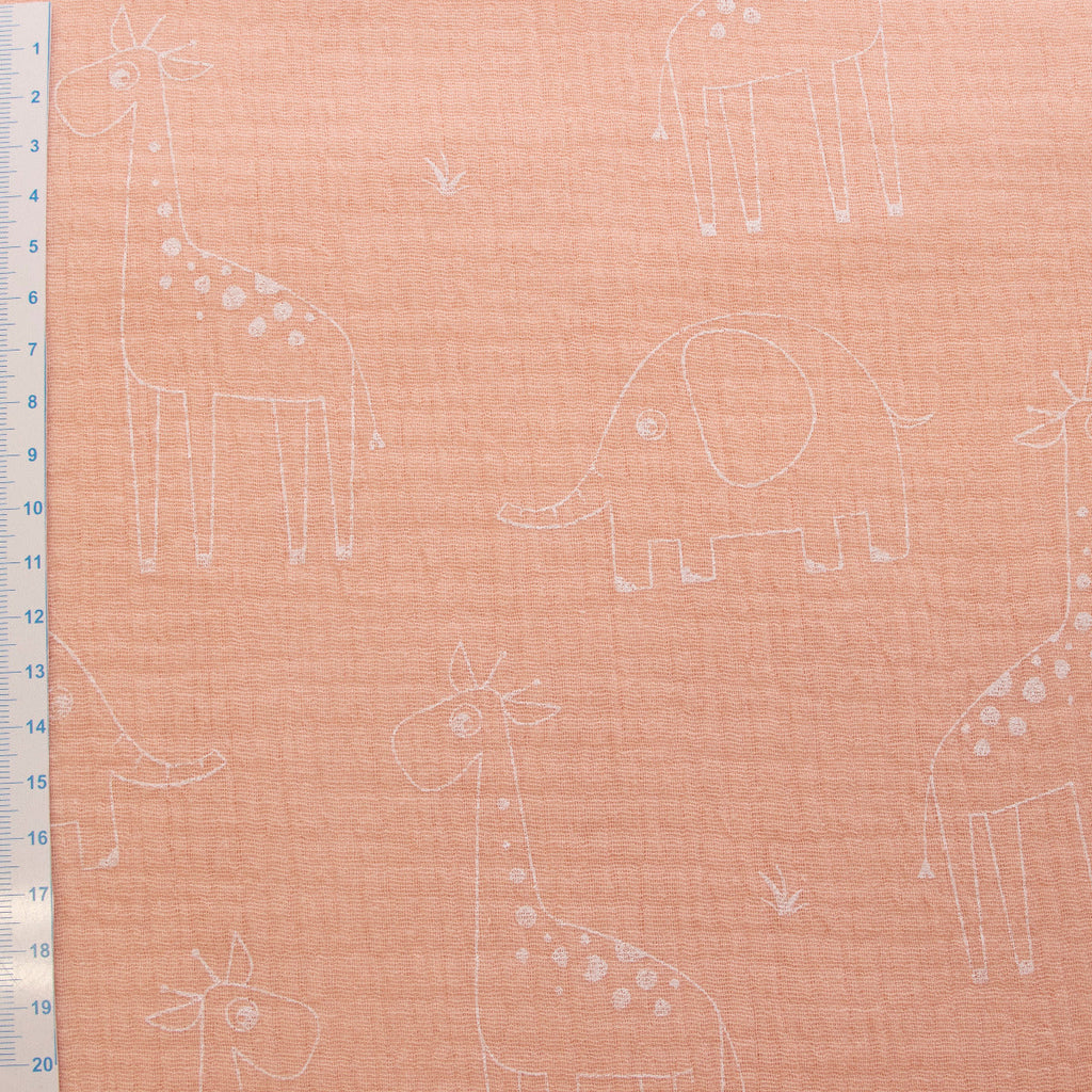 Zartes Musselin-Abenteuer für kleine Träumer! Dieser wunderbar weiche Double Gauze besticht durch sein charmantes Design mit verspielten Giraffen und Elefanten in warmem Lachsrosa. Der luftige Baumwollstoff ist perfekt für Babykleidung, Windeln, Tücher und Accessoires – atmungsaktiv, hautfreundlich und angenehm leicht. Die doppelte Gewebeschicht sorgt für extra Stabilität ohne dabei an Geschmeidigkeit zu verlieren. Ein Stoff, der Qualität und Spielfreude vereint!