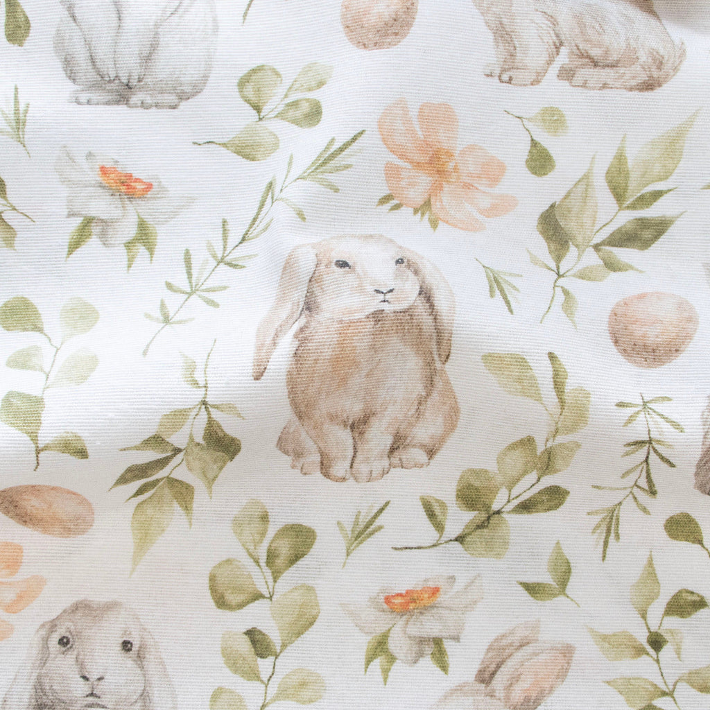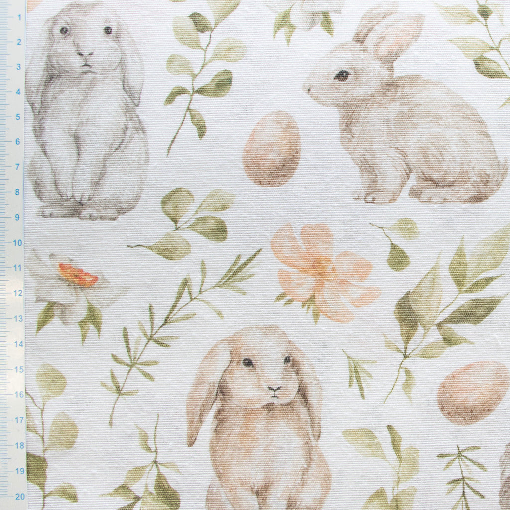 Niedliche Häschen hüpfen fröhlich über diesen charmanten Dekostoff im Half-Panama-Weave. Das cremeweiße Gewebe mit verspieltem Hasen-Muster bringt Wärme und Verspieltheit in jeden Raum – perfekt für Kissen, Vorhänge oder kreative Nähprojekte. Die robuste Qualität des Half-Panama garantiert Langlebigkeit und angenehme Haptik. Ein süßer Stoff, der Kinderherzen höher schlagen lässt und auch Erwachsene zum Lächeln bringt.