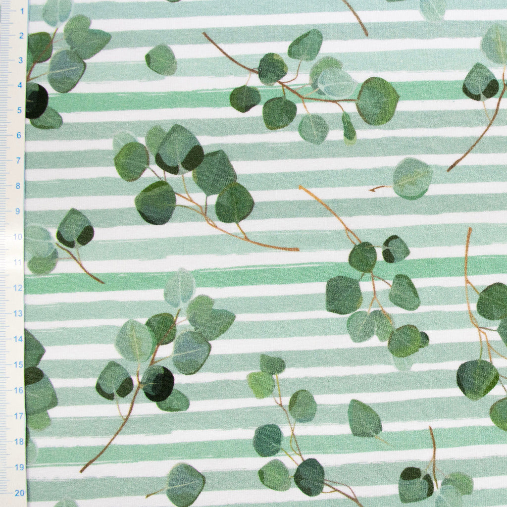 French Terry mit digitalgedrucktem Eukalyptus-Muster auf feinen Streifen – eine moderne Kombination aus Funktionalität und Design. Der weiche, atmungsaktive Stoff eignet sich ideal für Freizeitkleidung, Hoodies und Loungewear. Das weiß-grüne Farbspiel verleiht jedem Projekt zeitlose Eleganz. French Terry besticht durch seine charakteristische Rückseite mit Schlingenstruktur, die maximalen Komfort bietet, während die glatte Vorderseite das hochwertige Digitaldruck-Motiv perfekt zur Geltung bringt. Ein vielseitiger Stoff für anspruchsvolle Näher und Designer.