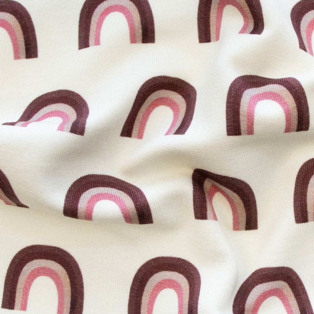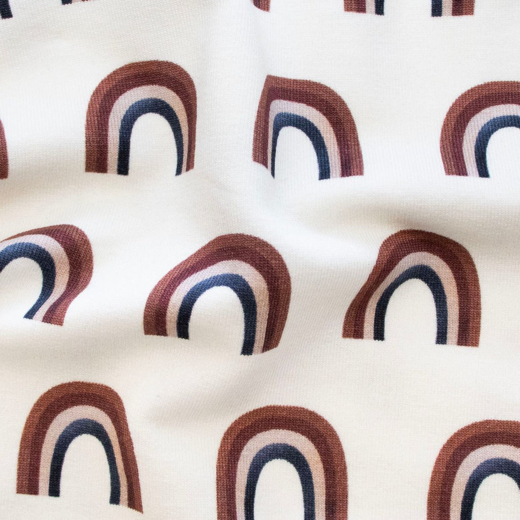 French Terry mit lebendigen Regenbogenmustern auf warmem Wollweiß – ideal für Kinderbekleidung. Der weiche, atmungsaktive Stoff bietet maximalen Tragekomfort und ist strapazierfähig genug für aktive Kinder. Der hochwertige Digitaldruck sorgt für brillante Farben, die auch nach mehrfachem Waschen erhalten bleiben. Perfekt für Hoodies, Jogger und Freizeitkleidung, die Kindern Bewegungsfreiheit und Style zugleich geben.