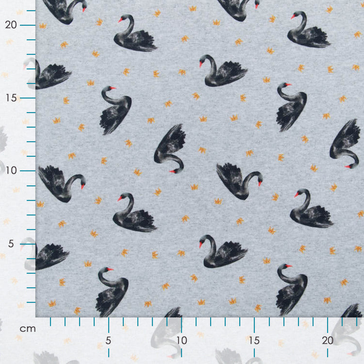 Majestätische Schwäne mit funkelnden Kronen zieren diesen hochwertigen French Terry im angesagten Melange-Grau. Der digitale Druck besticht durch lebendige Farben und feine Details, die auch nach vielen Wäschen erhalten bleiben. Der weiche, atmungsaktive Stoff eignet sich perfekt für gemütliche Hoodies, Jogger oder Loungewear, die Komfort und Style vereinen. Ein verspieltes Design für alle, die königliche Eleganz mit lässiger Gemütlichkeit lieben.