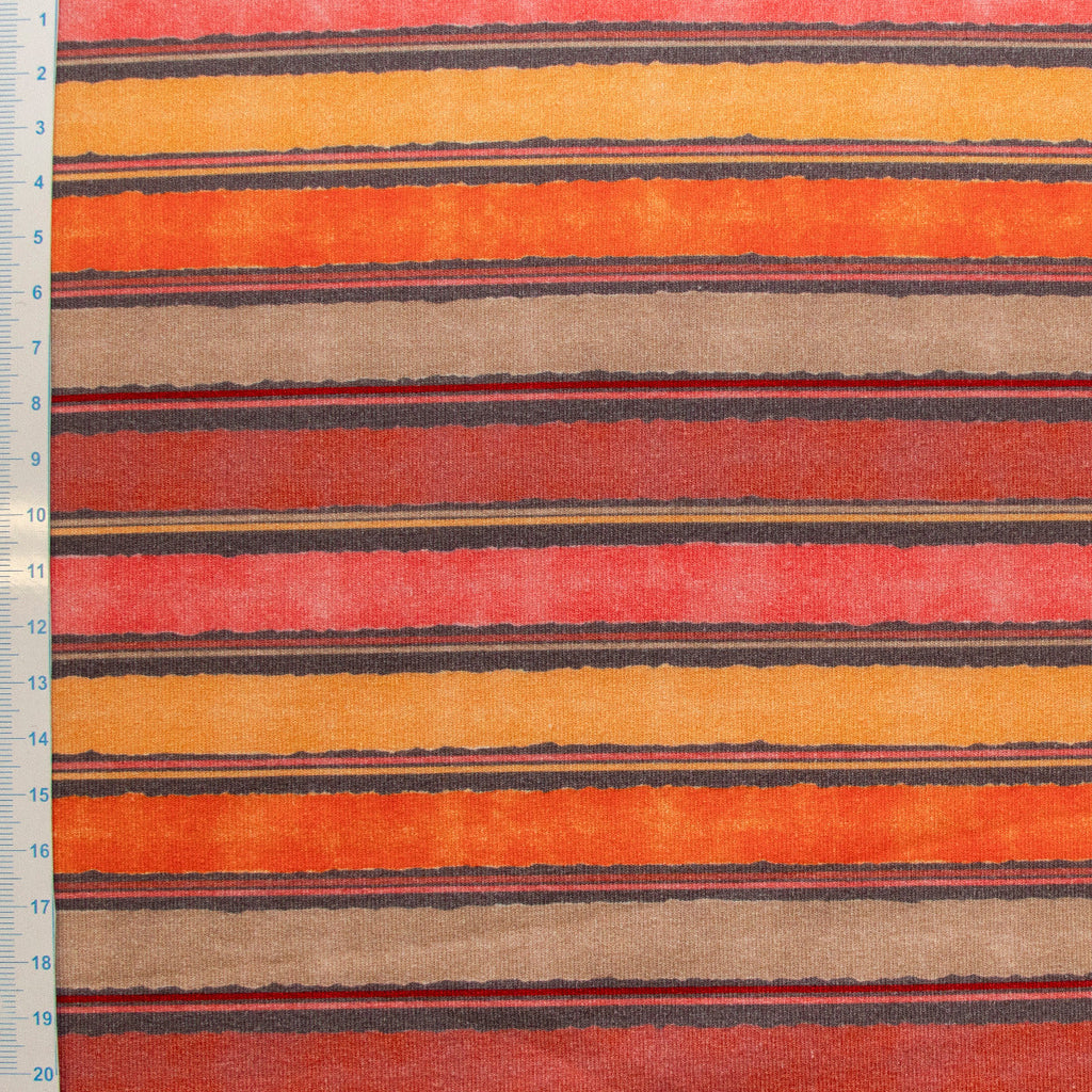 French Terry mit digitalgedrucktem Streifenmuster in warmen Orange- und Rosttönen – ein Statement-Stoff für ausdrucksstarke Kreationen. Die samtig-weiche Oberfläche kombiniert Tragekomfort mit visueller Wirkung, perfekt für Sweatshirts, Jogger und Freizeitmode. Die charakteristische Schlingenrückseite sorgt für Wärmeisolation und Bewegungsfreiheit, während die glatte Vorderseite das präzise Digitaldruck-Design in voller Farbintensität zeigt. Ideal für Designer, die Qualität und zeitgenössische Ästhetik verbinden möchten.