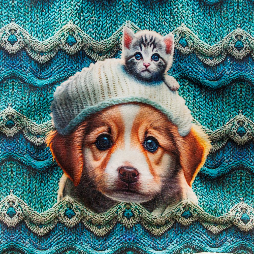 French Terry Mützenpanel mit charmanten Hund- und Kätzchen-Motiven im hochwertigen Digitaldruck. Das 50 x 150 cm große Panel eignet sich ideal zur Herstellung von Mützen, Loops und anderen Accessoires. Der weiche French Terry bietet angenehmen Tragekomfort und Atmungsaktivität. Das durchdachte Panelformat ermöglicht effiziente Zuschnitte mit minimalem Verschnitt. Perfekt für Näherinnen und Näher, die individuelle, liebevoll gestaltete Kopfbedeckungen kreieren möchten.