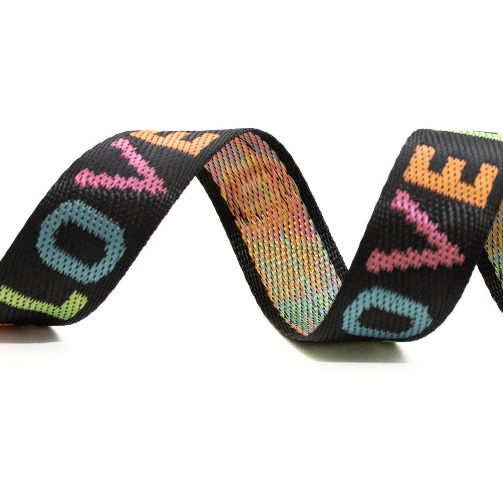 Dieses charmante Gurtband besticht durch sein verspieltes LOVE-Design in bunter Schrift auf klassischem Schwarz. Mit einer Breite von etwa 25 mm ist es vielseitig einsetzbar – perfekt für Taschen, Rucksäcke, Gürtel oder kreative DIY-Projekte. Die farbenfrohen Buchstaben bringen Persönlichkeit in jeden Nähprojekt und machen es zum idealen Accessoire für alle, die ihre Liebe zum Detail zeigen möchten. Robust und praktisch zugleich!
