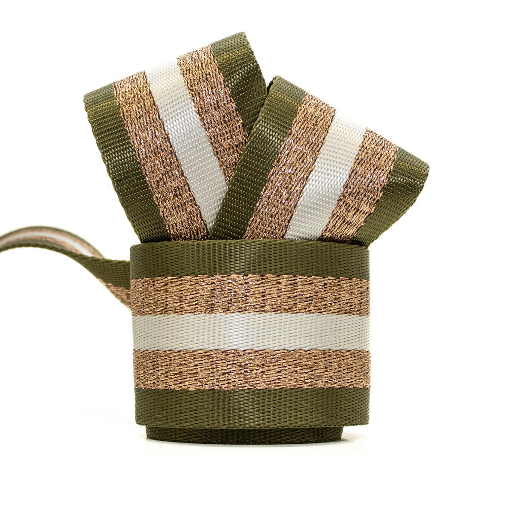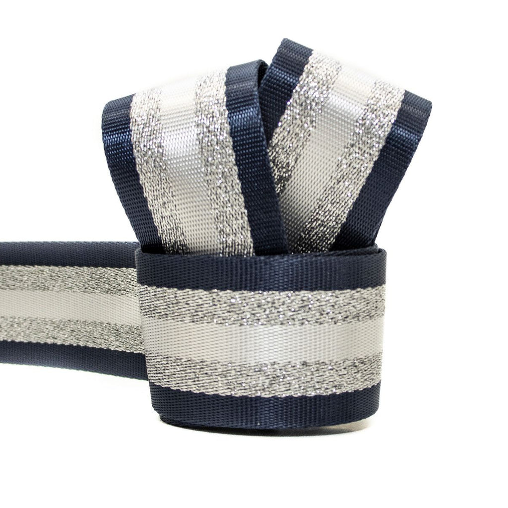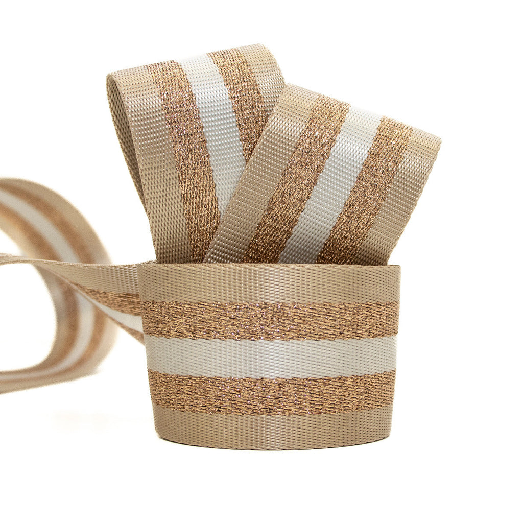 Dieses ca. 50mm breite Gurtband besticht durch seine eleganten Streifen, durchzogen mit glänzenden Glitzerfäden, die im Licht wunderbar schimmern. Perfekt zum Verzieren von Taschen, als Gürtel, für Nähprojekte oder kreative Bastelarbeiten. Das hochwertige Material ist robust und vielseitig einsetzbar – lass deiner Fantasie freien Lauf und verleihe deinen Lieblingsstücken einen Hauch von Glamour und Glanz!