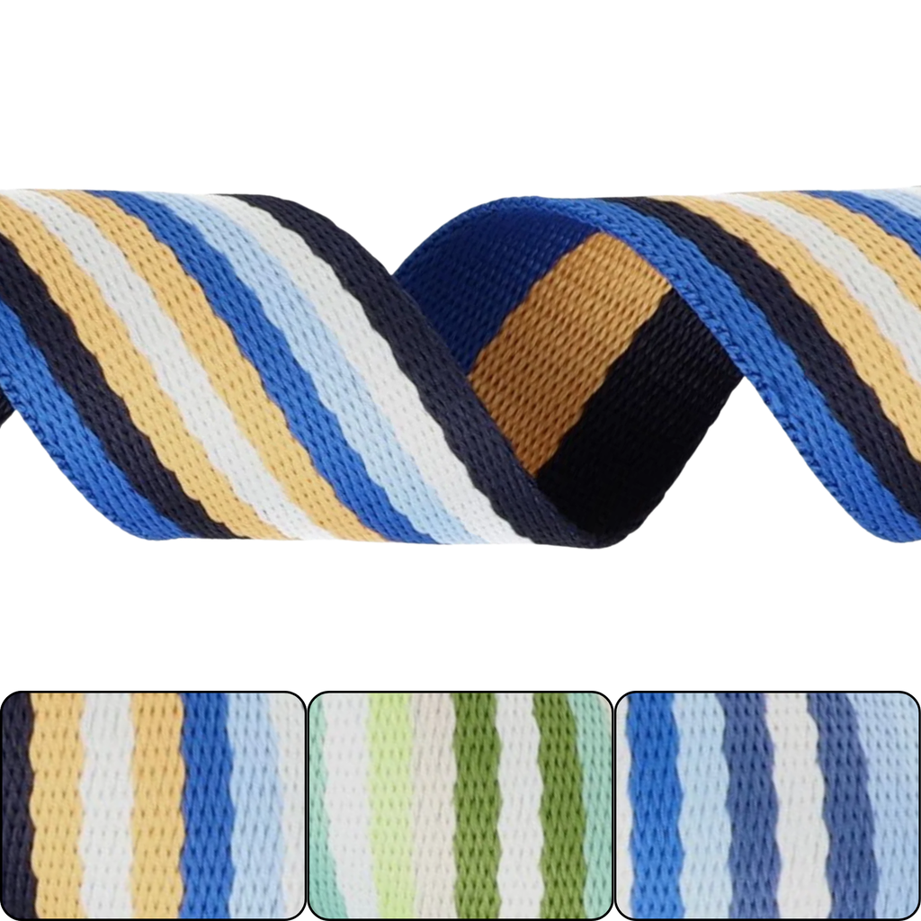 Dieses 38 mm breite Gurtband aus Polyester-Baumwolle besticht durch sein dekoratives, gewebtes Streifenmuster in verschiedenen Farbvarianten. Harmonisch kombinierte Farbtöne, von dezenten Naturfarben bis zu lebhaften Akzenten, schaffen einen modernen und dynamischen Look. Die abwechselnden schmalen Streifen machen das Band zum perfekten Material zum Verzieren, Nähen und Basteln – ideal, um Ihren Projekten eine individuelle und stilvolle Note zu verleihen.