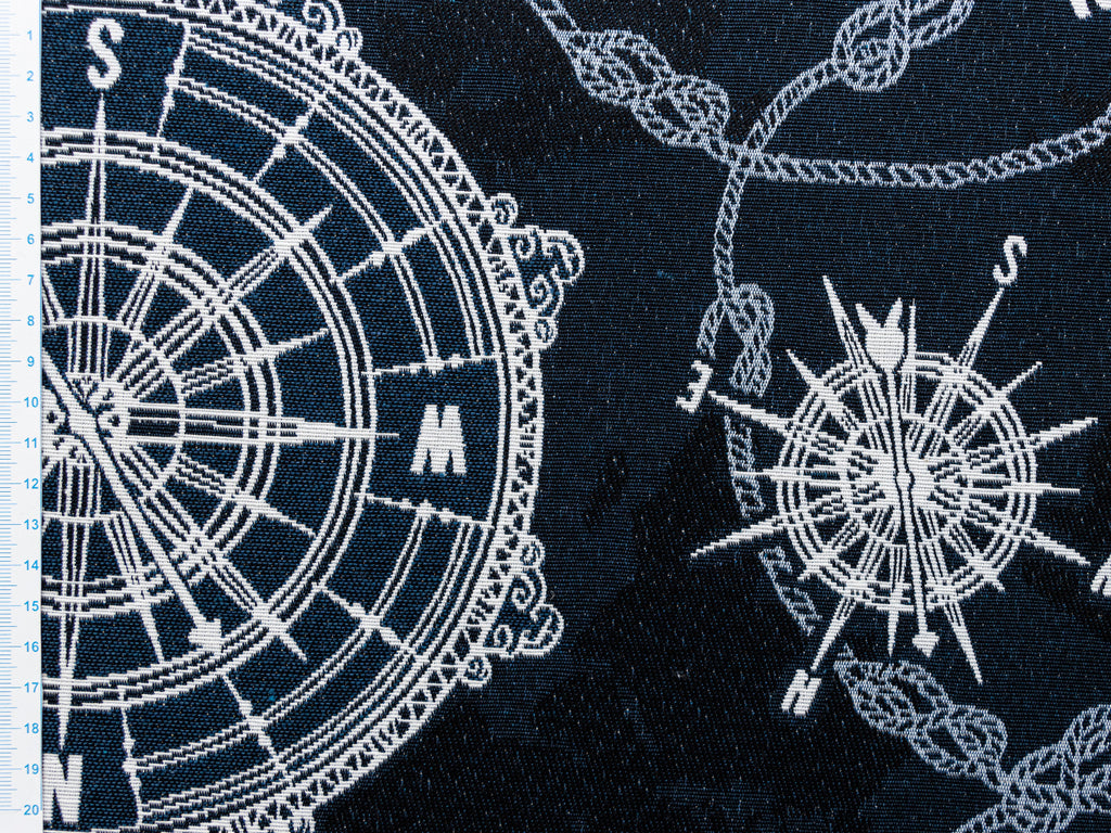 Navigiere durch deine Kreativität mit diesem fesselnden Jacquard-Webstoff! Vintage-Kompasse tanzen über tiefes Marineblau und verleihen jedem Projekt nautischen Flair mit modernem Twist. Ob Polsterung, Dekoration oder die perfekte Reisetasche – dieser robuste Stoff ist dein zuverlässiger Begleiter. Die klassische Farbgebung passt zu fast allem, während die feinen Details beim genauen Hinschauen zum Vorschein kommen. Entdecke die Abenteurer in dir!