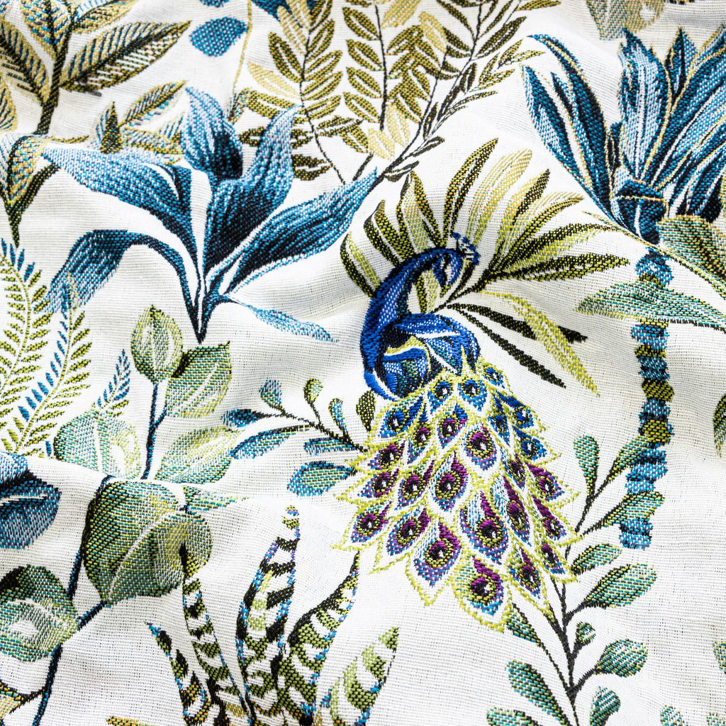Eleganter Jacquard-Gobelin mit zeitlosem Pfauen-Motiv in harmonischer wollweißer Farbgebung. Dieses hochwertige Dekostoff-Gewebe besticht durch seine feinen Strukturen und die detailreiche Webkunst, die klassische Eleganz mit modernem Design verbindet. Ideal für anspruchsvolle Polsterprojekte, Kissenbezüge oder Wandbespannungen. Die robuste Jacquard-Webtechnik garantiert Langlebigkeit und Farbbeständigkeit. Ein Statement-Stoff für Innenräume mit Charakter und Geschmack.