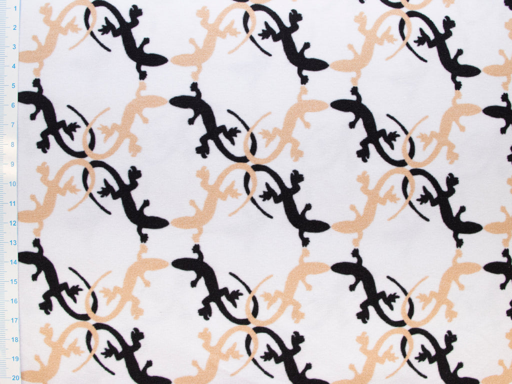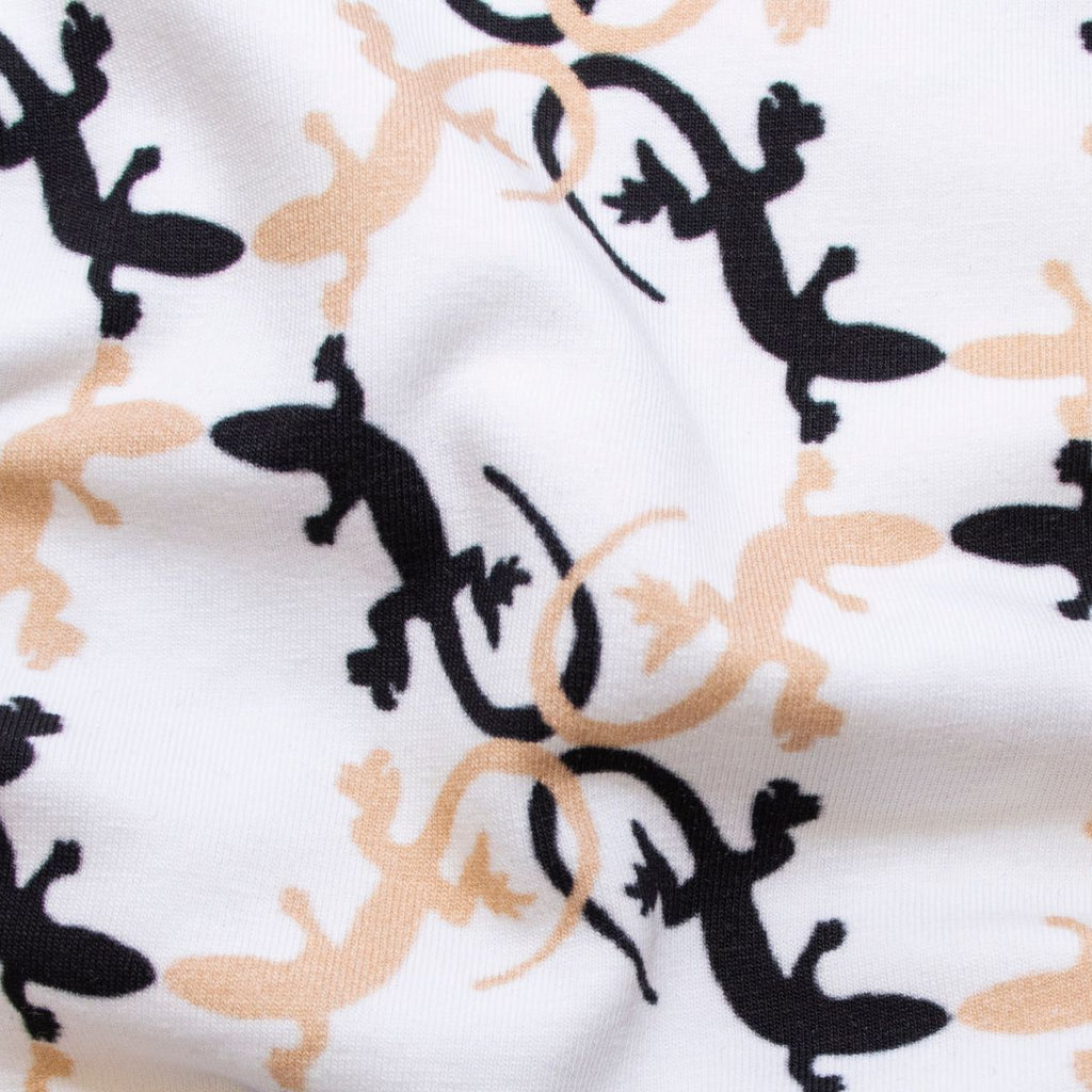 Entdecke diesen verspielten Jersey aus reiner Baumwolle mit charmanten Eidechsen-Ornamenten auf klassischem Weiß. Das feine Muster verleiht deinen Projekten eine verspielte Note – perfekt für Kinderkleidung, Accessoires oder gemütliche Heimtextilien. Der weiche, atmungsaktive Stoff sitzt angenehm auf der Haut und ist pflegeleicht. Ideal für alle, die Natur-Motive mit modernem Design lieben.