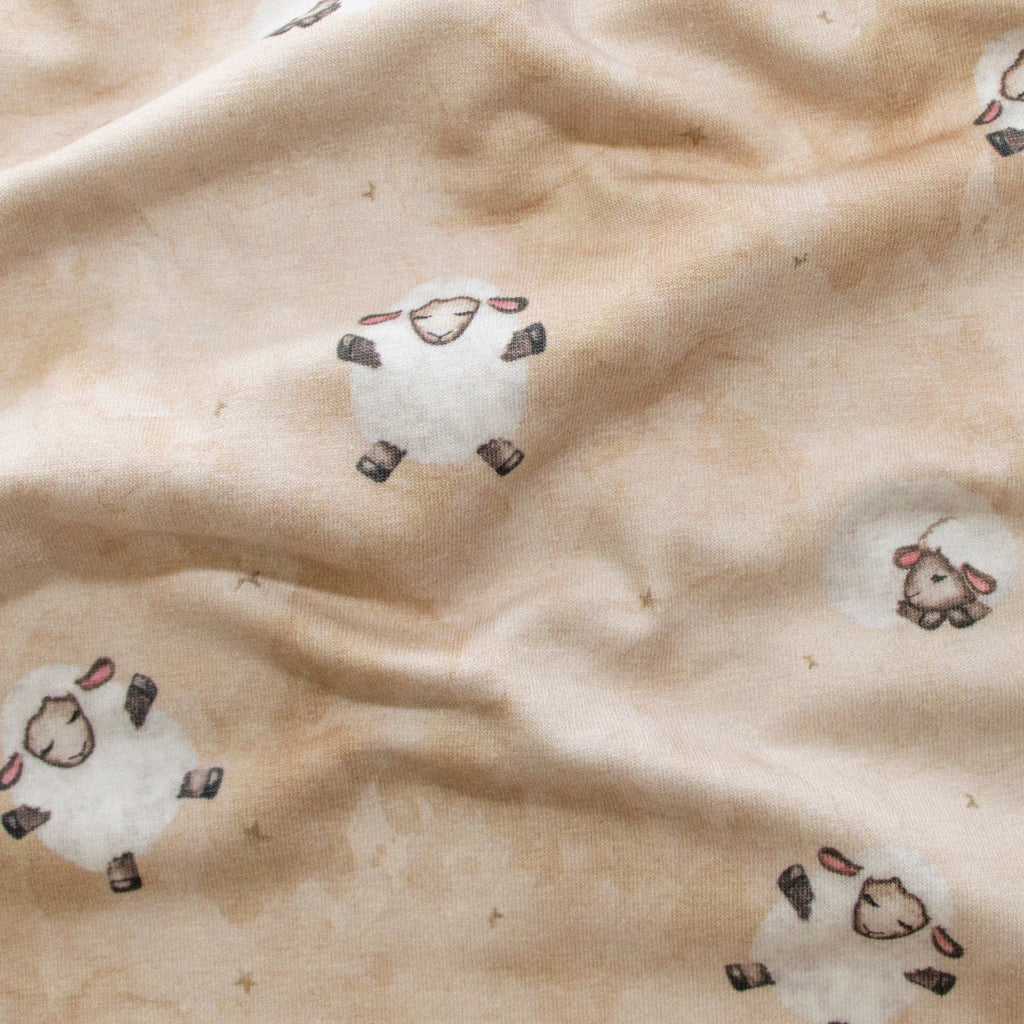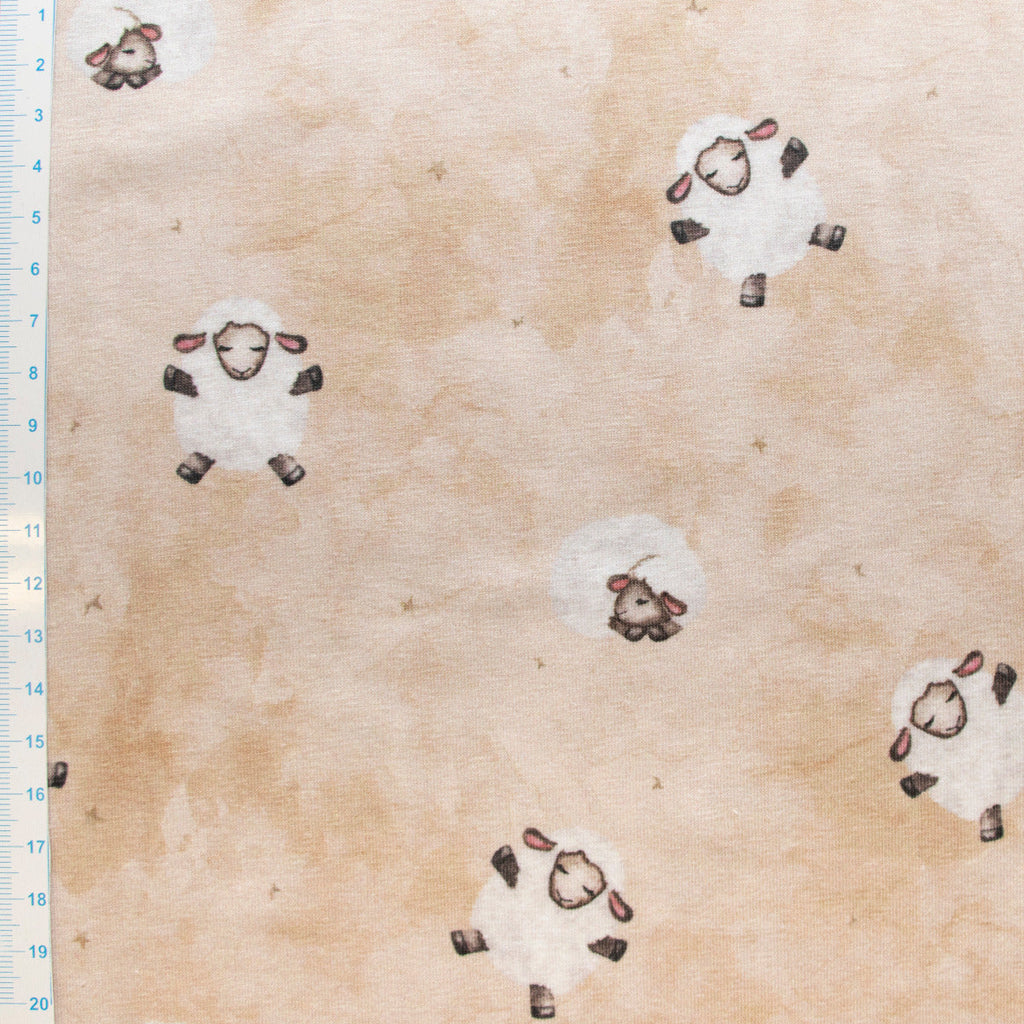 Flauschige Schafe springen über diesen kuscheligen Jersey aus reiner Baumwolle – perfekt für gemütliche Kinderkleidung, Patchwork-Projekte oder kuschelige Heimtextilien. Das warme Beige schafft eine beruhigende Atmosphäre, während das weiche Material sanft zur Haut ist. Ideal für alle, die Natur und Komfort lieben!