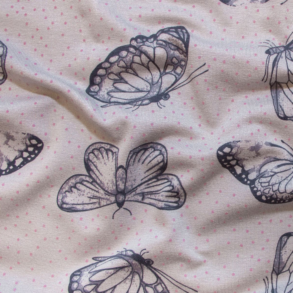 Jersey Baumwolle – Schmetterlinge – lila – grau Flatternde Schmetterlinge tanzen über diesen weichen Baumwoll-Jersey in harmonischen Lila- und Grautönen. Perfekt für verspielte Kinderkleidung, gemütliche Homewear oder kreative Nähprojekte, die Freude ausstrahlen sollen. Der hochwertige Jersey bietet angenehmen Tragekomfort und lässt sich leicht verarbeiten – ideal für alle, die Farbe und Leichtigkeit lieben.