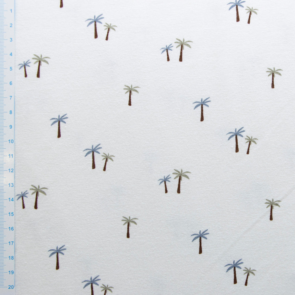 Dieser weiche Jersey besticht mit einem verspielten Palmenmuster auf wollweißem Grund – perfekt für Kinderkleidung, die Spaß macht. Das angenehm elastische Material sitzt bequem, lässt sich leicht verarbeiten und hält auch wilden Spieltagen stand. Ideal für T-Shirts, Kleider oder Hoodies, die Kinder lieben werden. Ein Stoff, der Kreativität und Komfort vereint!