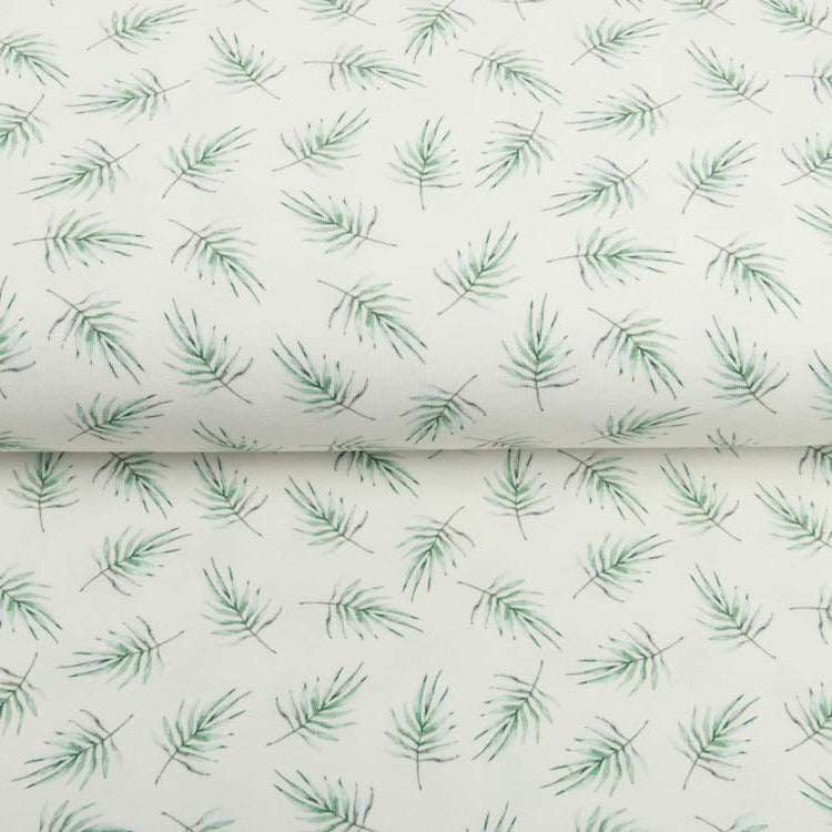 Zartes Jersey mit verspieltem Blätterzweig-Muster in warmem Wollweiß – perfekt für gemütliche Kleidungsstücke, die sich herrlich weich anfühlen. Das fließende Material schmiegt sich angenehm an und eignet sich wunderbar für Shirts, Kleider oder Hoodies. Ein zeitloses Design, das Natur-Charme mit modernem Komfort verbindet und in jede Garderobe passt.