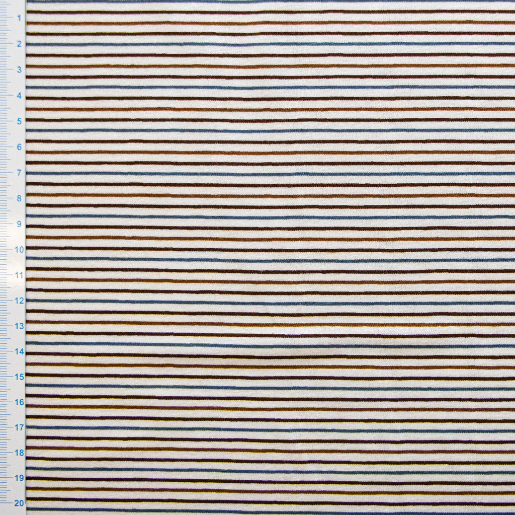 Fröhliche Streifenfreude trifft auf weiches Jersey! Dieses vielseitige Stoff-Highlight besticht durch lebendige, bunte Streifen auf warmem Wollweiß – perfekt für Kleidungsstücke mit Charakter. Das angenehm elastische Jersey-Material schmiegt sich komfortabel an und eignet sich ideal für T-Shirts, Kleider oder gemütliche Loungewear. Die farbenfrohe Streifenkomposition bringt Bewegung in jeden Schnitt und lässt sich wunderbar mit Uni-Farben kombinieren. Ein Stoff, der Spaß beim Nähen verspricht und garantiert gute Laune trägt!