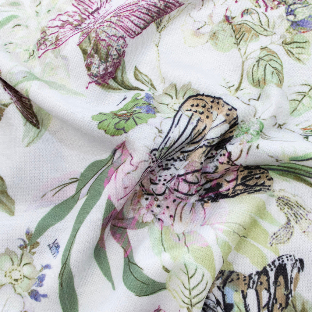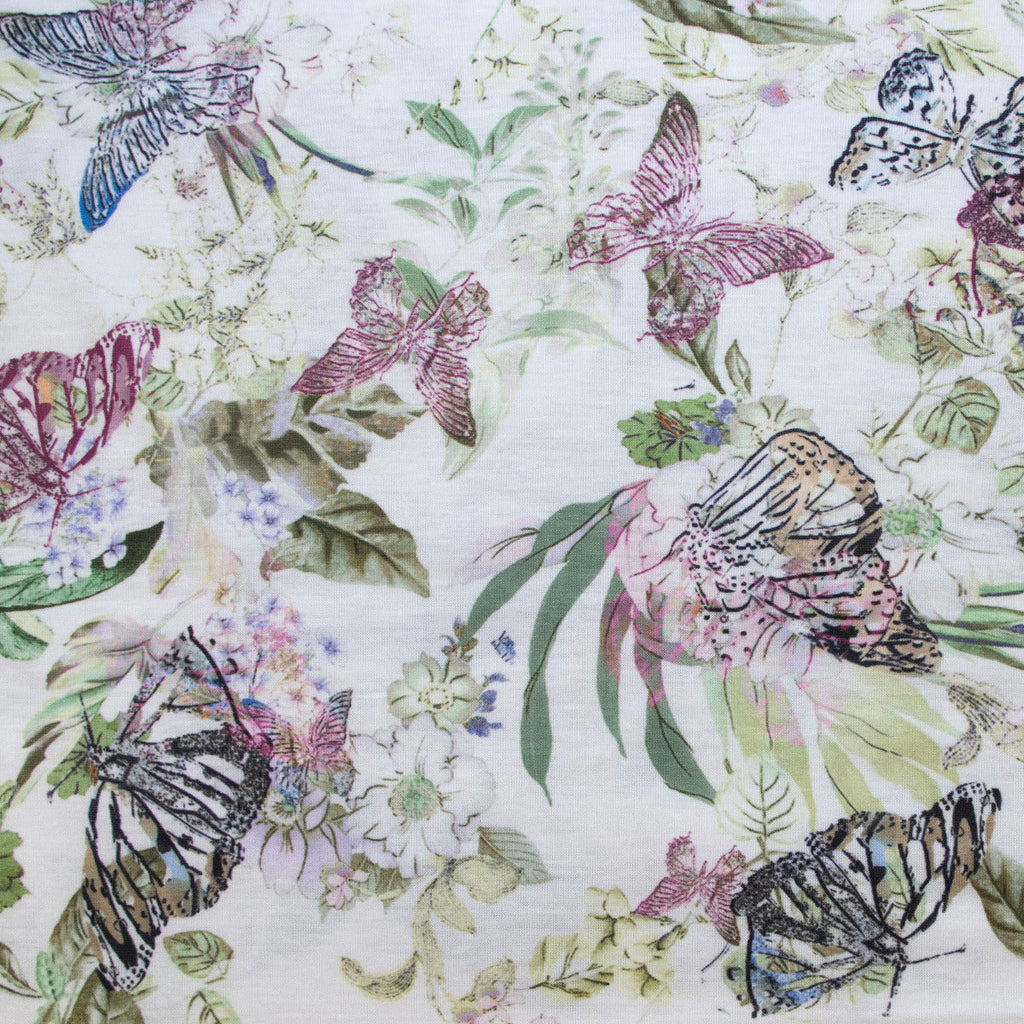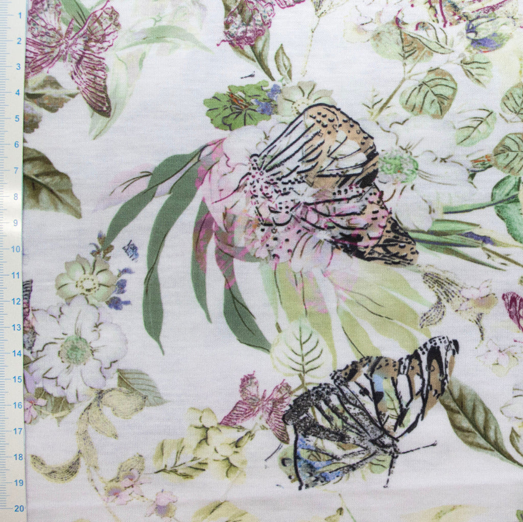 Dieser wunderbare Jersey besticht durch sein verspieltes Digitaldruck-Design mit bunten Blumen und flatternden Schmetterlingen auf klassischem Weiß. Das Motiv bringt Leichtigkeit und Naturfreude in jeden Schnitt – perfekt für Kleider, Shirts oder Kinderbekleidung, die zum Lächeln einlädt. Der weiche Jersey-Stoff schmiegt sich angenehm an die Haut und ermöglicht maximale Bewegungsfreiheit. Ein fröhliches Textil für alle, die das Besondere lieben und ihrer Kreativität freien Lauf lassen möchten.