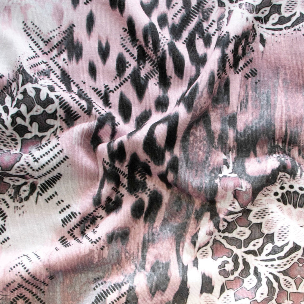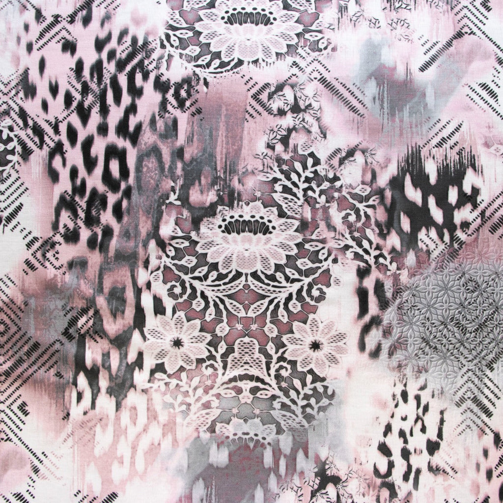 Jersey Digitaldruck mit verspieltem Mix aus floralen Mustern und trendigem Animalprint in warmem Rosa. Der hochwertige Digitaldruck besticht durch lebendige Farben und gestochen scharfe Details. Das elastische Jersey-Material schmiegt sich angenehm an und eignet sich perfekt für Kleidungsstücke mit Bewegungsfreiheit – von Shirts über Kleider bis zu Leggings. Die Kombination aus Natur- und Wildnis-Motiven verleiht jedem Projekt eine moderne, verspielte Note.