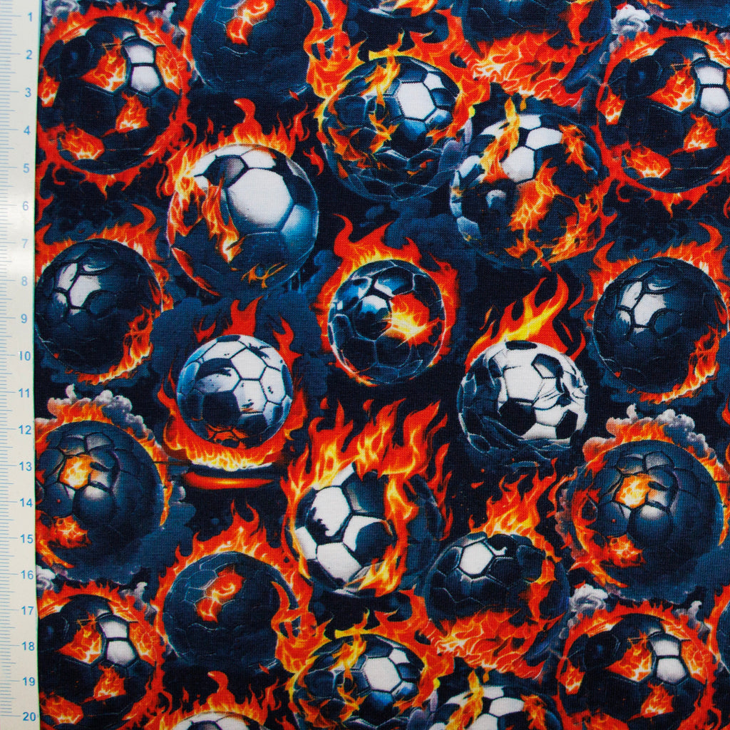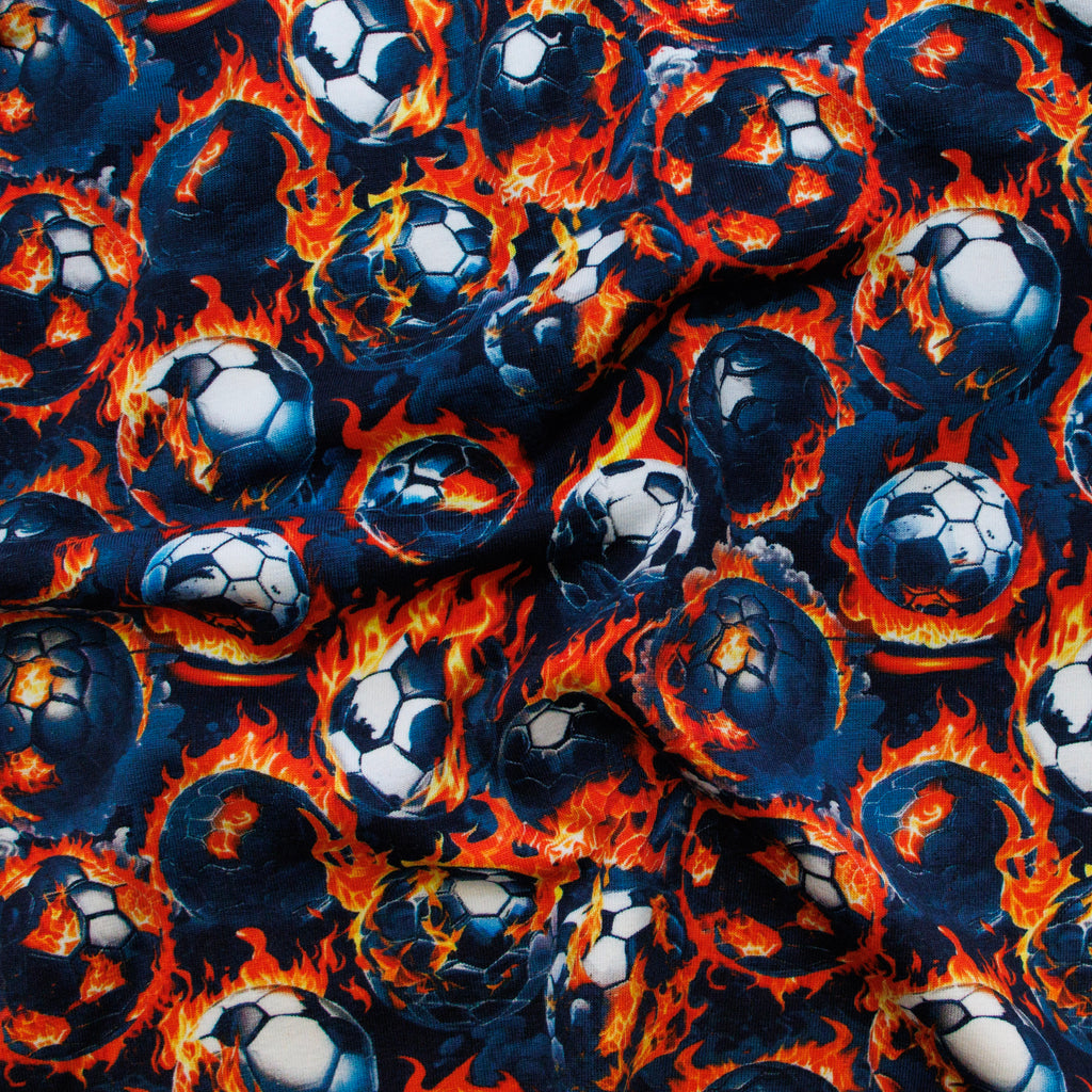 Dynamischer Jersey mit temperamentvollem Digitaldruck: Fußbälle umgeben von lodernden Flammen auf marinebauem Untergrund. Das Design sprüht vor Energie und Bewegung – perfekt für kleine Fußballfans, die ihre Leidenschaft für den Sport zeigen möchten. Der hochwertige Digitaldruck sitzt dauerhaft auf dem weichen Jersey-Stoff und behält seine Leuchtkraft auch nach vielen Wäschen. Ein Statement-Piece für jeden jungen Sportler mit Stil!
