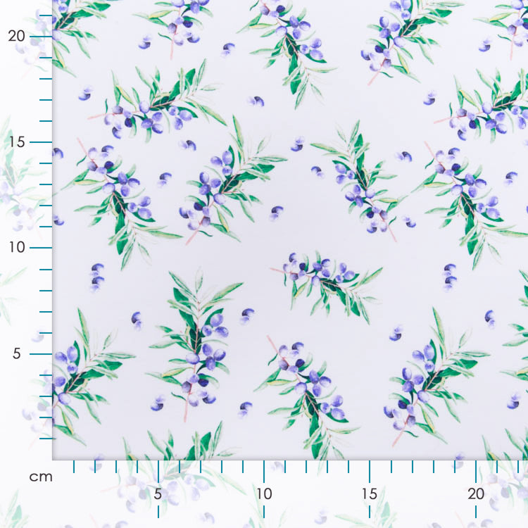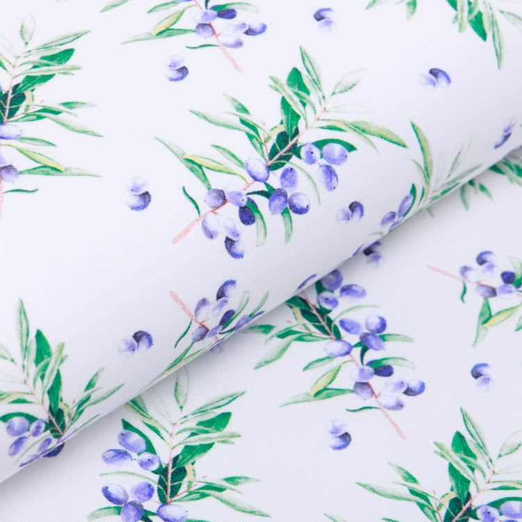 Dieser wunderbar weiche Jersey besticht durch sein charmantes Blaubeerstrauch-Muster in lebendigen Blautönen auf warmem Wollweiß. Der hochwertige Digitaldruck sorgt für gestochen scharfe Details und brillante Farben, die auch nach vielen Wäschen erhalten bleiben. Der elastische Stoff schmiegt sich angenehm an und eignet sich perfekt für gemütliche Kleidungsstücke, die Bewegungsfreiheit bieten. Ob Shirt, Kleid oder Leggings – mit diesem verspielten Design bringst du Natur-Charme in deinen Alltag!
