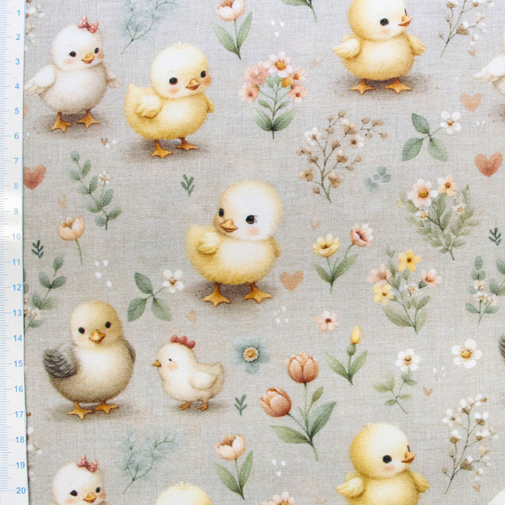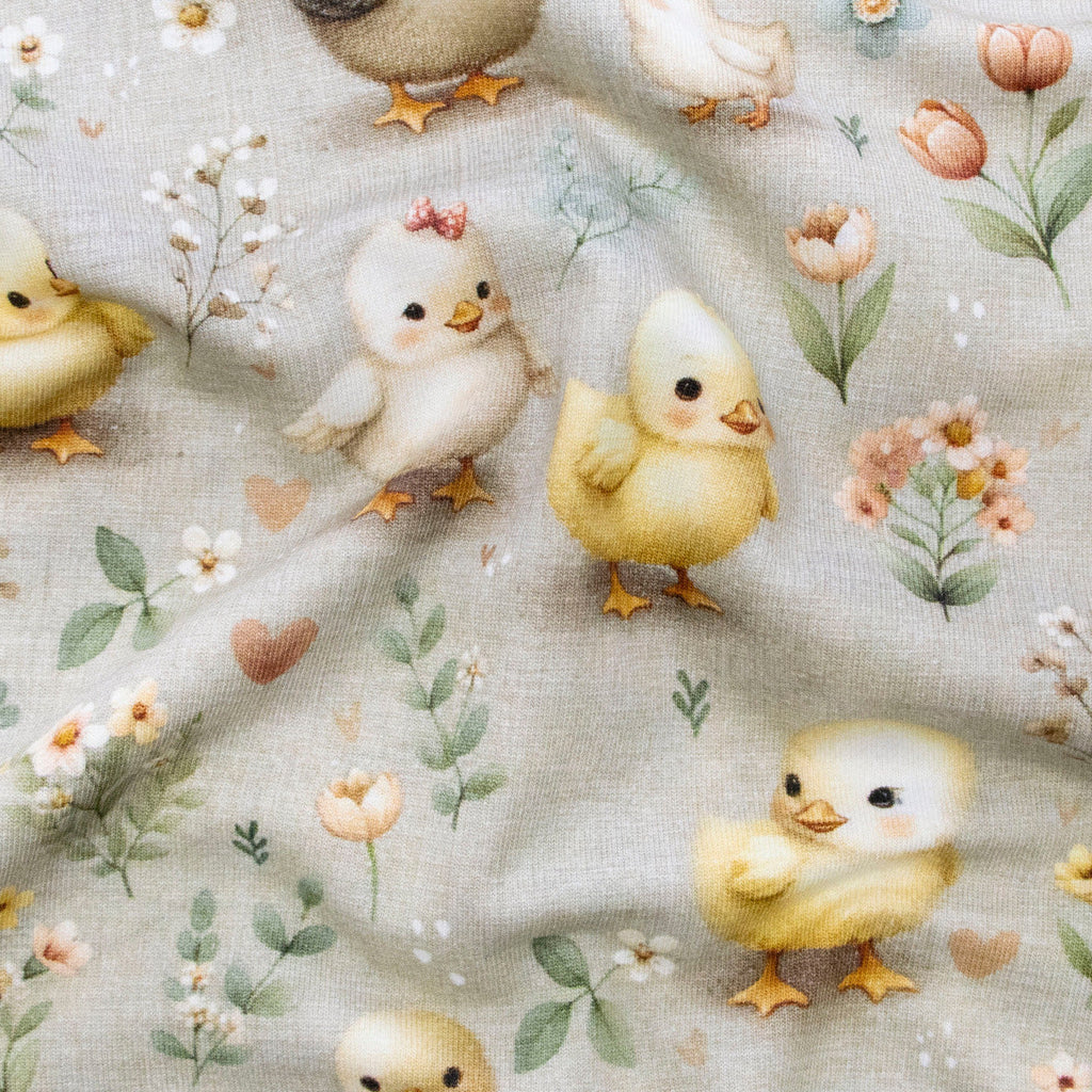 Niedliche Küken hüpfen fröhlich über diesen hochwertigen Jersey-Stoff im warmen Beige – perfekt für verspielte Kinderkleidung, Patchwork-Projekte oder gemütliche Heimtextilien. Der lebendige Digitaldruck bringt die süßen Federbällchen zum Leben und sorgt für strahlende Farben, die auch nach vielen Wäschen erhalten bleiben. Der weiche, elastische Jersey schmiegt sich angenehm an die Haut und eignet sich ideal für T-Shirts, Kleider und Accessoires. Ein Stoff, der Freude beim Nähen und Tragen bringt!
