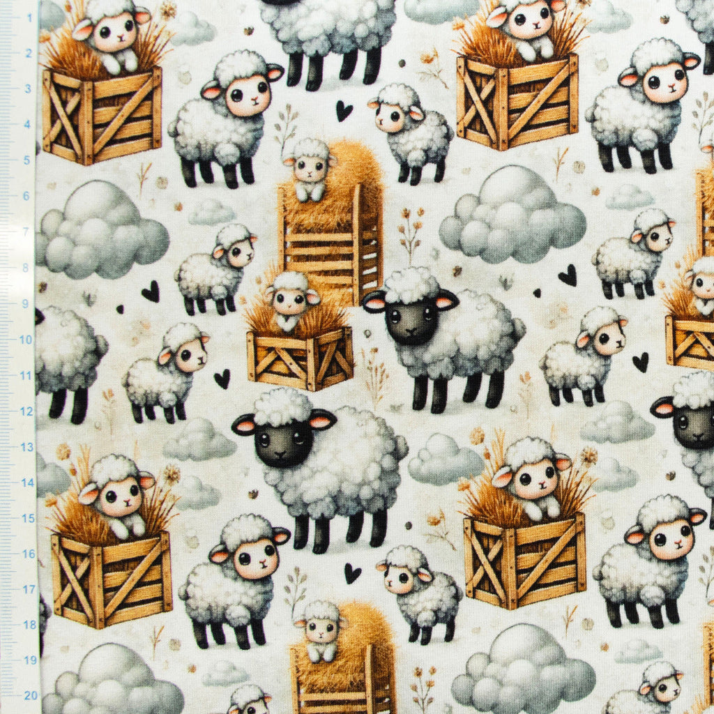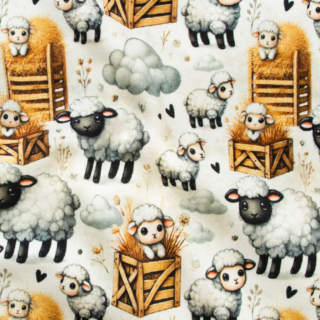 Niedliche Schafe hüpfen über diesen hochwertigen Jersey-Stoff im charmanten Digitaldruck-Verfahren. Das wollweiße Grundgewebe bildet die perfekte Kulisse für die verspielten Tiermotive und eignet sich wunderbar für Kinderkleidung, Bettwäsche oder gemütliche Heimtextilien. Der weiche Jersey-Stoff schmiegt sich angenehm an die Haut und verspricht maximalen Tragekomfort. Ein fröhliches Design, das Kinderherzen höher schlagen lässt!