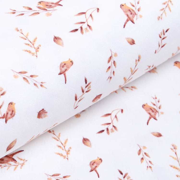 Jersey Feinstrick Stoff mit charmanten Vogelmotiven in zartem Wollweiß – perfekt für kuschelige Kinderkleidung, gemütliche Accessoires oder verspielte Heimtextilien. Das feine Ajoure-Pointoille-Muster verleiht dem weichen Material eine elegante Struktur und angenehme Atmungsaktivität. Ideal für Näherinnen, die liebevolle Details mit hohem Tragekomfort verbinden möchten. Ein vielseitiger Stoff, der Kreativität und Gemütlichkeit in einem vereint.