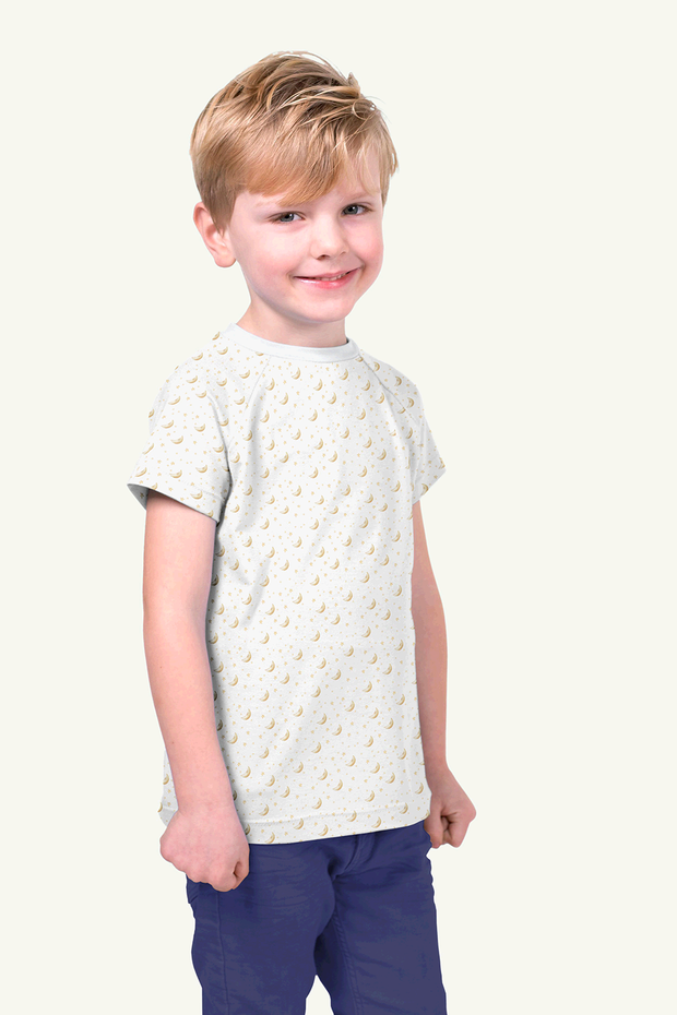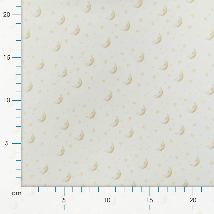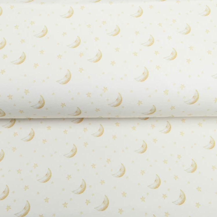 Träume in Stoff gegossen! Dieser wunderbar weiche Jersey besticht mit einem verspielten Muster aus Halbmonden und Sternen auf warmem Wollweiß. Perfekt für gemütliche Kinderkleidung, kuschelige Decken oder entspannte Loungewear. Die fließende Textur schmiegt sich angenehm an die Haut und lädt zum Träumen ein. Ein Stoff, der Fantasie und Komfort vereint – ideal für alle, die das Sanfte und Poetische lieben.