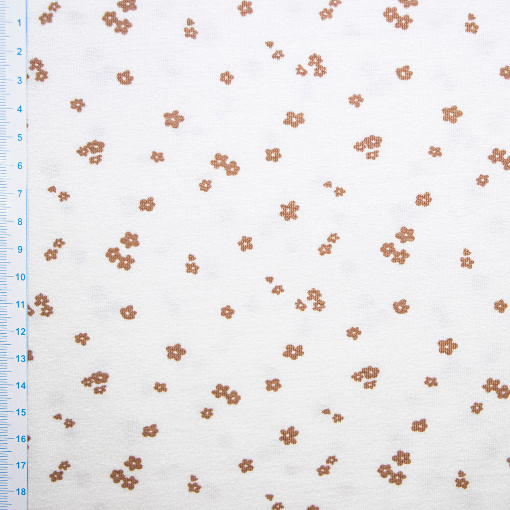 Jersey mit zarten Blümchen-Muster in warmem Wollweiß – perfekt für gemütliche Lieblingsstücke! Der weiche, elastische Stoff schmiegt sich angenehm an und eignet sich wunderbar für Shirts, Kleider oder Hoodies. Das niedliche Blüten-Design bringt Frische in deine Nähprojekte und lässt sich vielseitig kombinieren. Ein Stoff, der gute Laune macht!