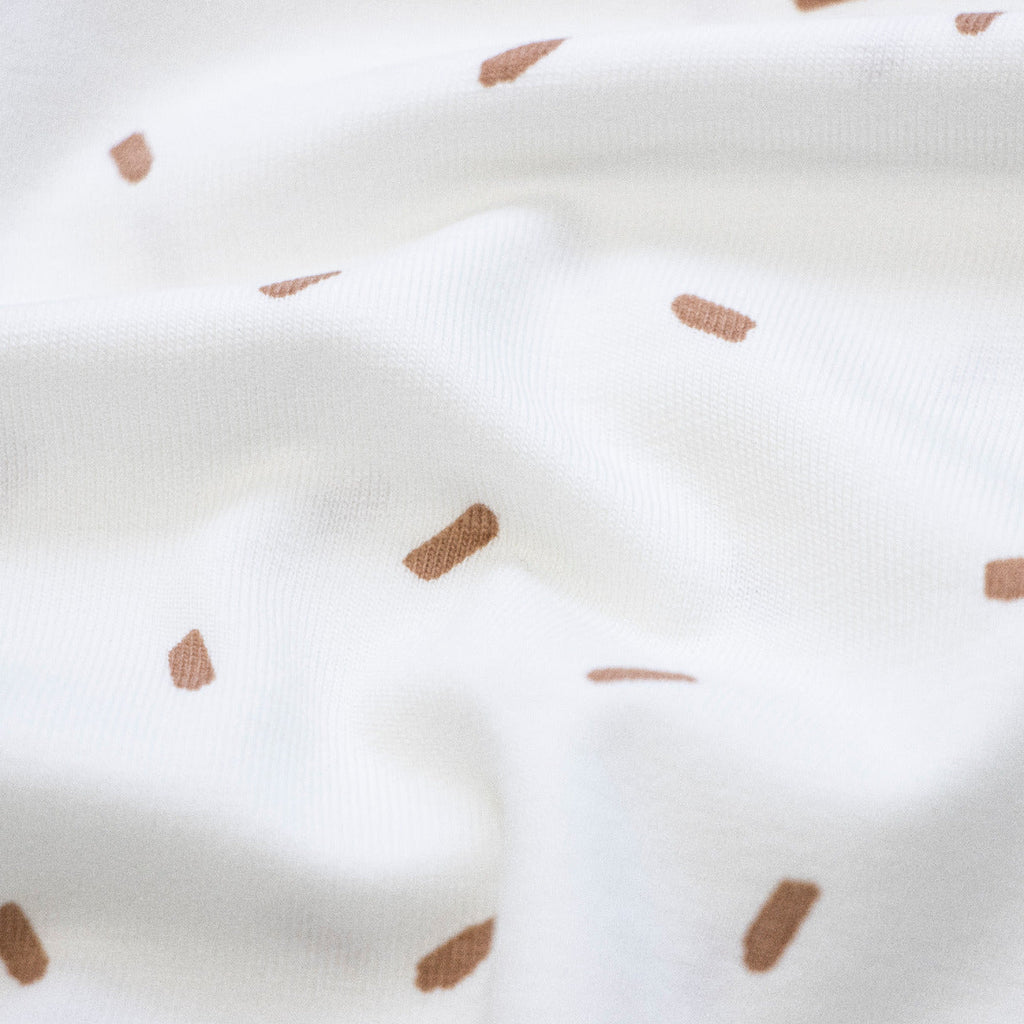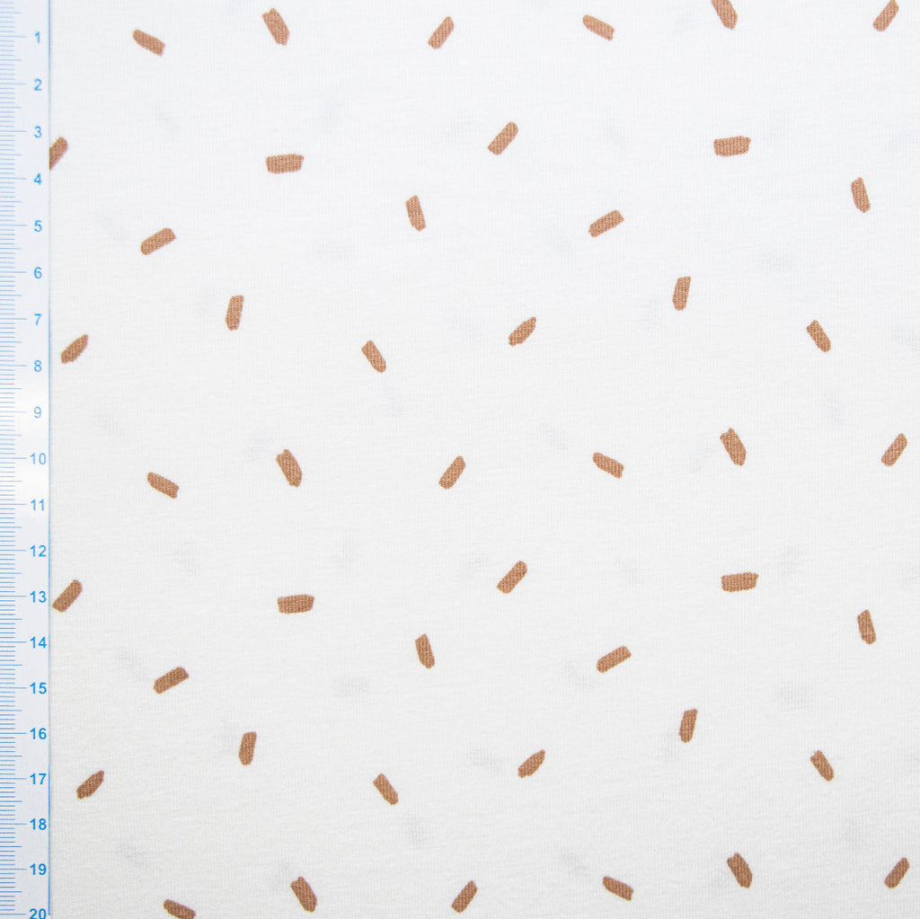 Dieser Jersey besticht durch sein verspieltes Design mit kurzen Pinselstrichen, die dem Stoff eine künstlerische Leichtigkeit verleihen. Das warme Wollweiß schafft eine zeitlose Basis, die sich mühelos kombinieren lässt. Der weiche Jersey eignet sich perfekt für gemütliche Kleidungsstücke, die Bewegungsfreiheit und Komfort bieten. Ob Shirt, Kleid oder Hoodie – dieser Stoff bringt Kreativität in deine Nähprojekte und überzeugt mit seinem modernen, abstrakten Muster.