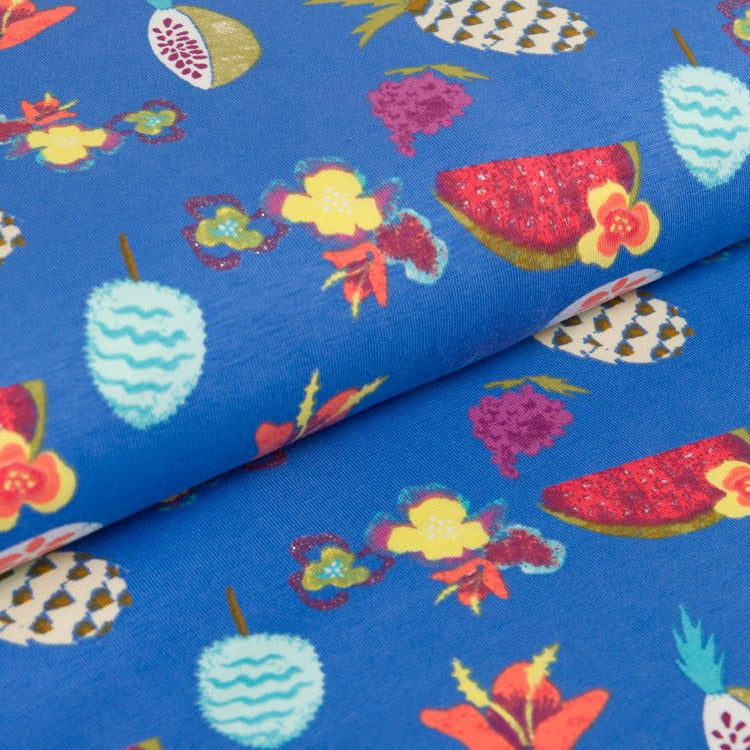 Jersey Little Darling – Glitzer – Früchte blau / bunt Bunte Früchte tanzen über diesen verspielten Jersey-Stoff in leuchtendem Blau – perfekt für kleine Abenteurer und ihre liebsten Kreationen. Das glitzernde Finish bringt extra Funkeln in jedes Projekt, während der weiche Jersey-Stoff sich herrlich angenehm anfühlt. Ideal für Kinderkleidung, Accessoires oder kuschelige Lieblingsstücke, die garantiert zum Lächeln bringen. Lassen Sie Ihrer Fantasie freien Lauf!