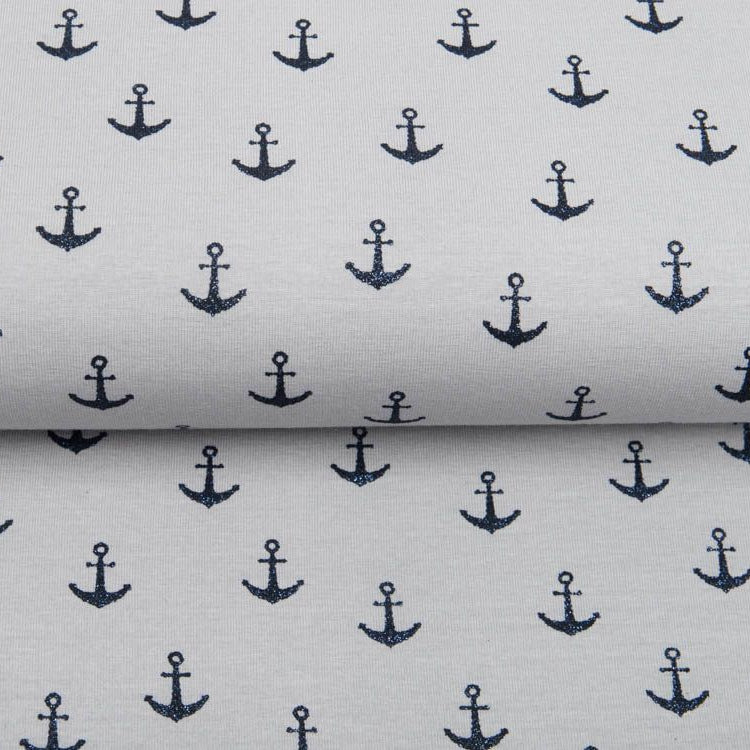 Bring Glanz in deine Nähprojekte mit diesem funkelnden Jersey, der klassische Anker-Motive mit schimmerndem Glitzer kombiniert. Das elegante Grau bildet die perfekte Kulisse für die glitzernden Details – ideal für festliche Kinderkleidung, funkelnde Accessoires oder Statement-Pieces mit Wow-Effekt. Der hochwertige Jersey-Stoff ist angenehm weich und tragbar, während die Glitzer-Applikation auch nach mehreren Wäschen ihre Brillanz behält. Ein verspielter Stoff für alle, die ein bisschen Extra-Glanz lieben.