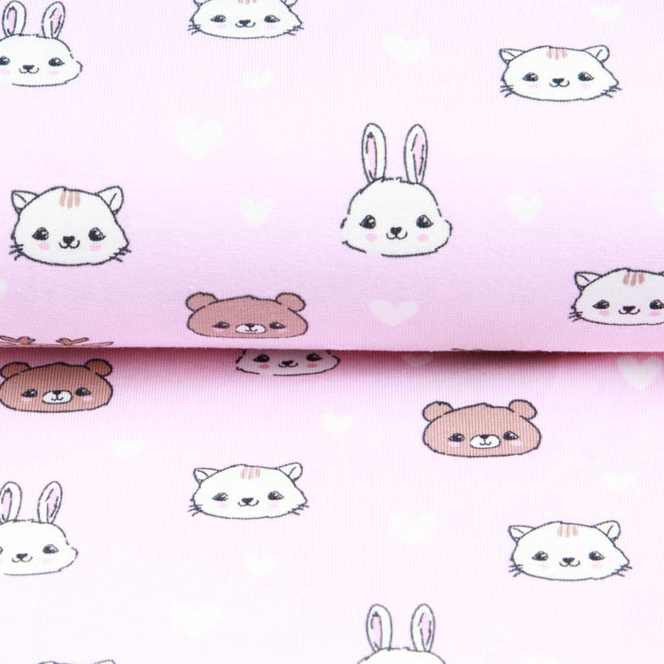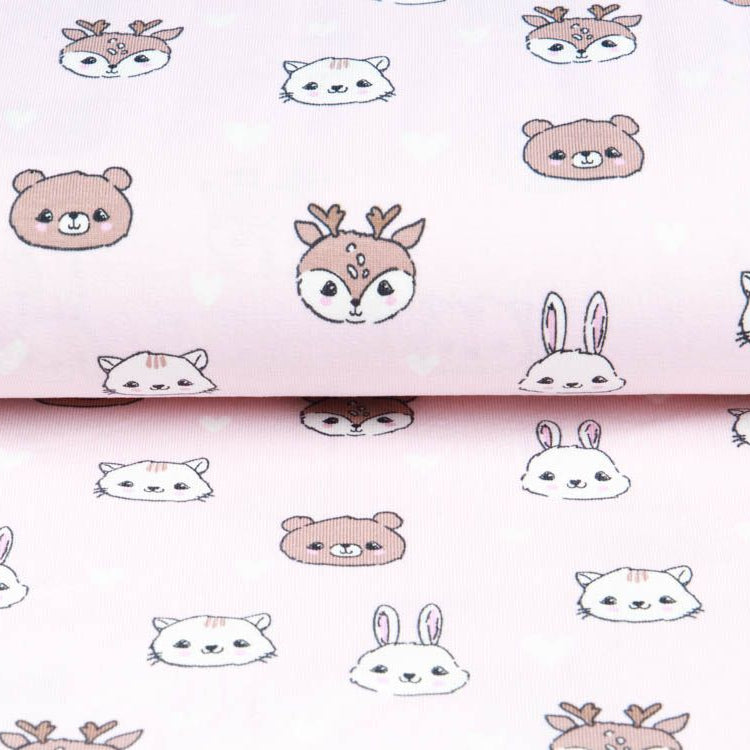 Niedlicher Jersey-Stoff mit verspielten Tiergesichtern und herzigen Herzen – perfekt für Kinderkleidung, Kuschelkissen oder bunte Accessoires. Das fröhliche Muster bringt Freude in jedes Nähprojekt und überzeugt mit weicher, angenehmer Haptik. Ideal für kleine und große Näh-Fans, die es lustig und liebevoll mögen!
