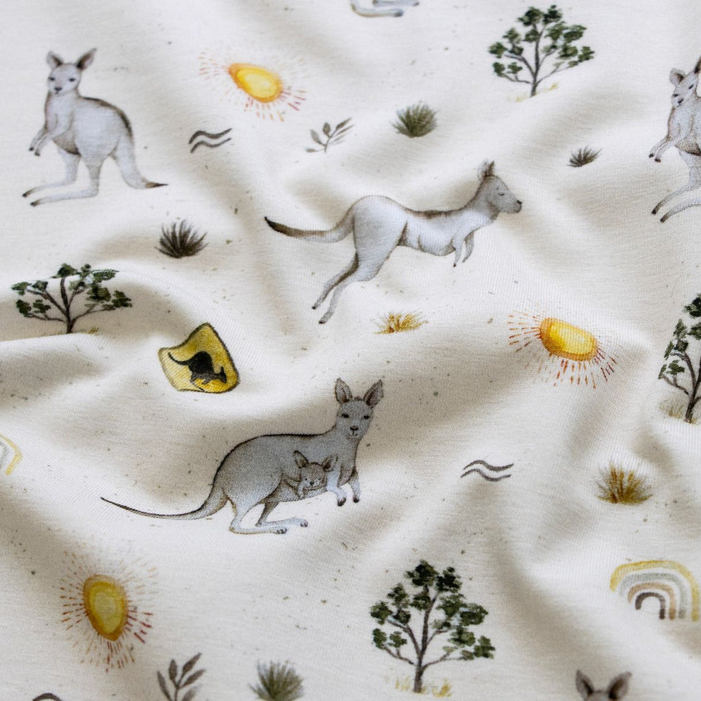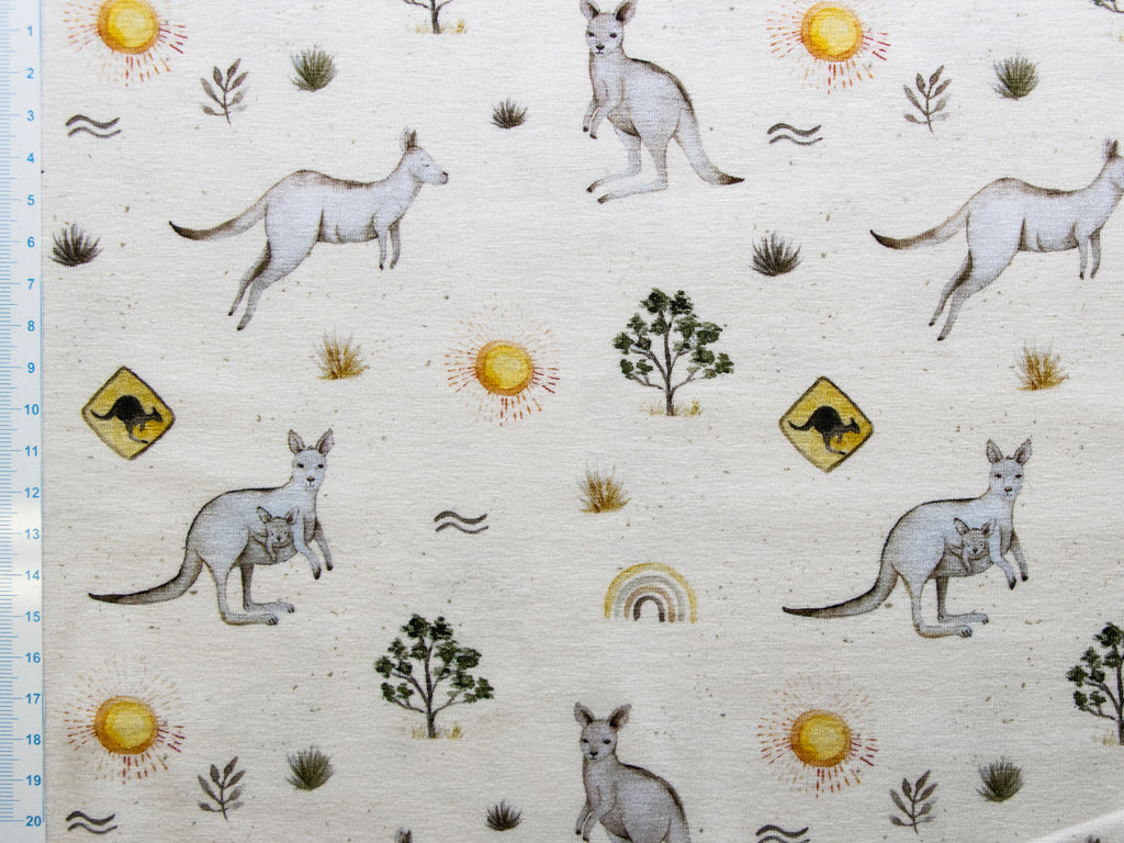 Hüpf mit uns nach Down Under! Dieser fröhliche Jersey besticht mit niedlichen springenden Kängurus, die Christiane Zielinski liebevoll in Szene gesetzt hat. Das weiche, elastische Gewebe eignet sich perfekt für gemütliche Kinderkleidung, Patchwork-Projekte oder kuschelige Accessoires. Mit seinem australischen Flair bringt dieser Stoff Abenteuer und Spielfreude in jedes Nähprojekt – ob für kleine Entdecker oder als Eyecatcher im Kinderzimmer.