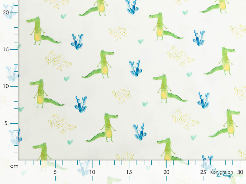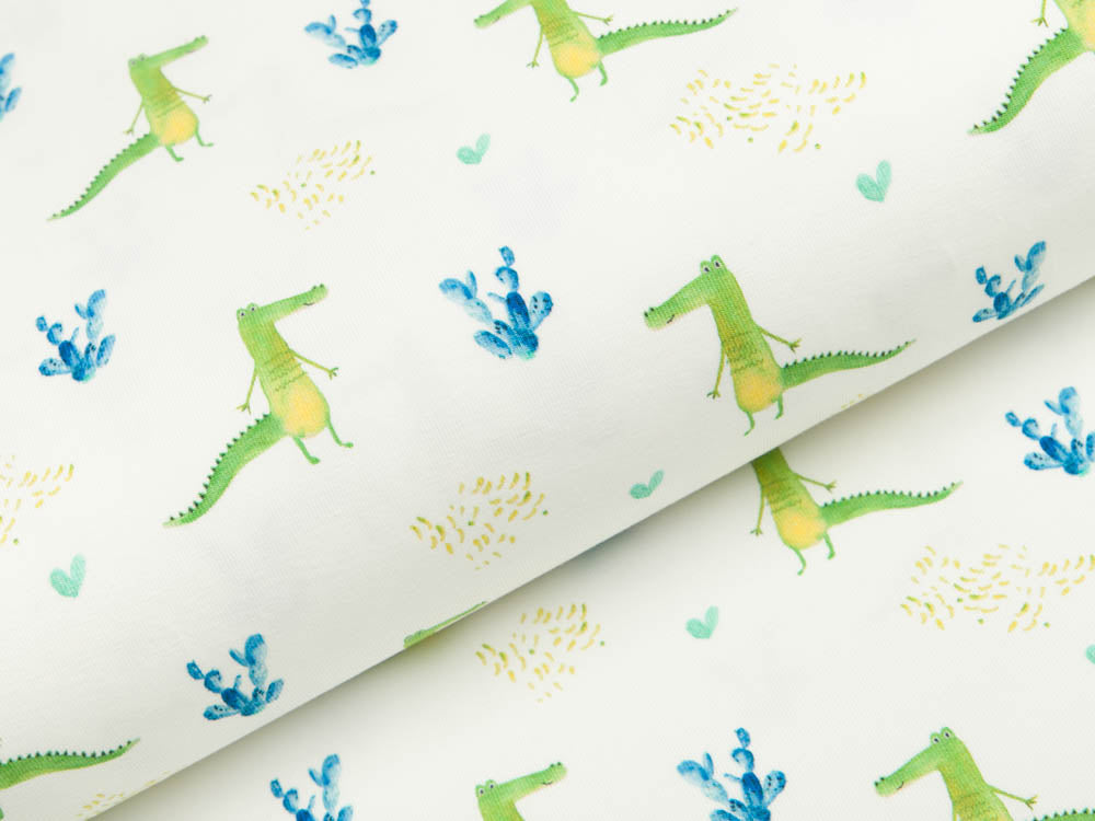 Jersey Swafing Tommy – Freche Krokodile in Weiß Niedliches Jersey-Kinderstoff mit verspieltem Krokodil-Muster auf weißem Grund. Das weiche, elastische Material sitzt angenehm auf der Haut und eignet sich perfekt für Kinderkleidung wie T-Shirts, Kleider und Pyjamas. Der hochwertige Swafing-Jersey bietet optimalen Tragekomfort und Bewegungsfreiheit für aktive Kids. Ideal für Nähanfänger und erfahrene Schneiderei gleichermaßen geeignet.