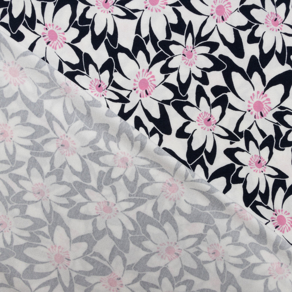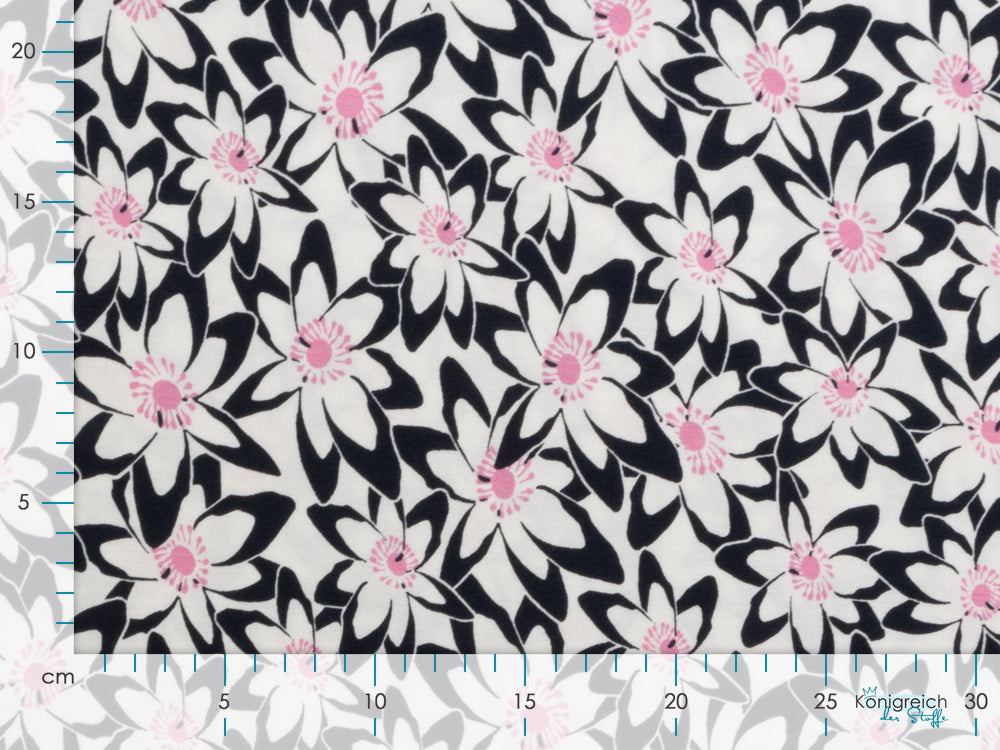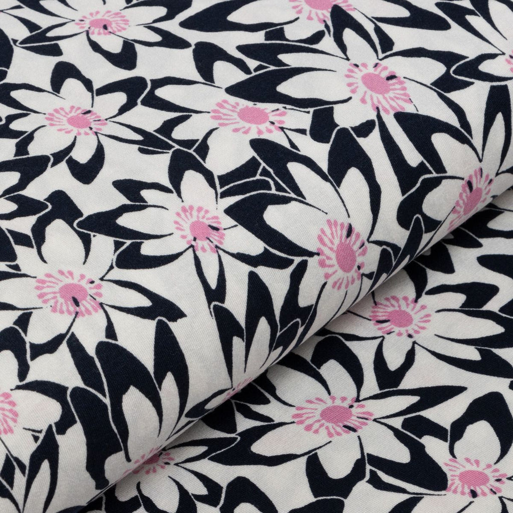 Jersey Viskose – Blumenwiese in Nachtblau/Weiß/Rosa Träume in Farbe mit diesem bezaubernden Viskose-Jersey, das eine lebendige Blumenwiese in harmonischen Tönen zeigt. Die Kombination aus tiefem Nachtblau, zartem Weiß und zartem Rosa schafft ein Muster, das sowohl beruhigend als auch inspirierend wirkt. Der geschmeidige Stoff fließt wunderbar und eignet sich hervorragend für Sommerkleider, luftige Tuniken oder gemütliche Loungewear. Ein Traum für Näherinnen und Näher, die ihren Projekten Persönlichkeit und Bewegung schenken möchten – ganz ohne Kompromisse beim Tragekomfort.