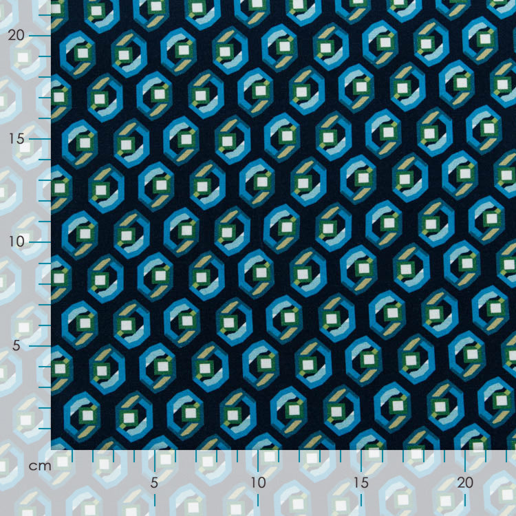 Jersey Viskose – Bunte Hexagons in Nachtblau Geometrische Freude trifft auf Tragekomfort! Dieser verspielte Viskose-Jersey besticht durch ein farbenfrohes Hexagon-Muster auf eleganter nachtblauer Grundlage. Die sanfte Viskose schmeichelt der Haut und bietet die perfekte Balance zwischen Struktur und Bewegungsfreiheit. Ideal für moderne Schnitte, die das Muster in den Fokus rücken – ob grafische Kleider, Statement-Shirts oder kreative Accessoires. Ein Stoff, der Näherinnen und Näher mit seinem lebendigen Design und der angenehmen Haptik zum Lächeln bringt.